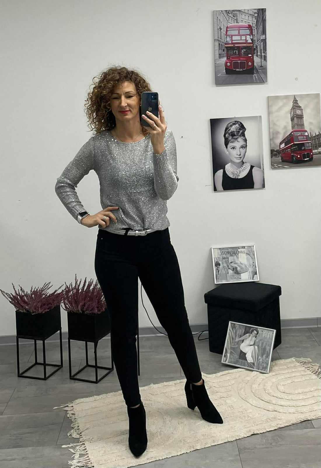 Laza kötésű, kerek nyakú felső, amelyet finoman flitteres, csillogó felület tesz igazán különlegessé. Tökéletes választás,...