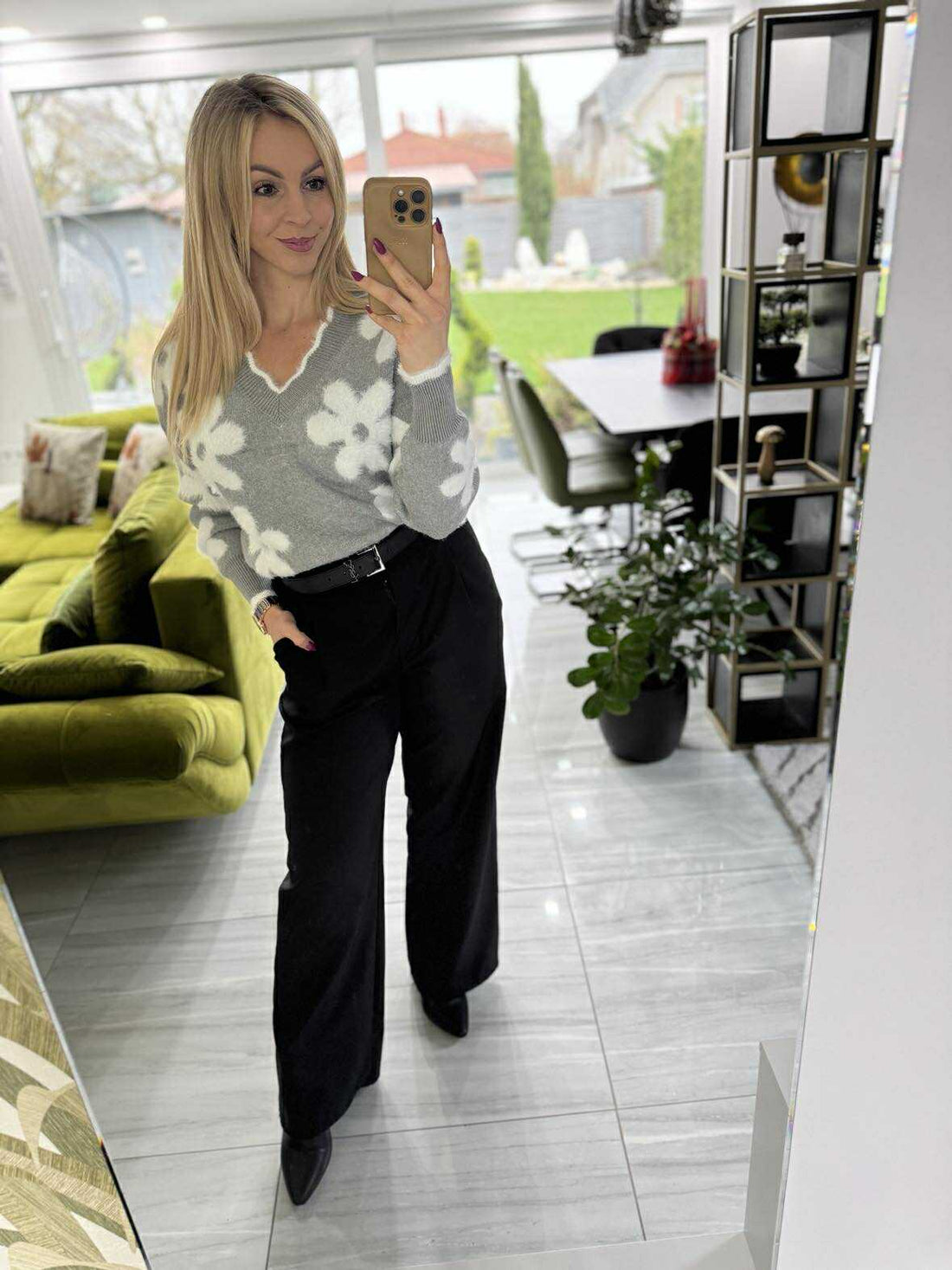 Puha kötött anyagból készült, kényelmes és mégis elegáns stílusú pulóver, amelyet az ujjakon és a...