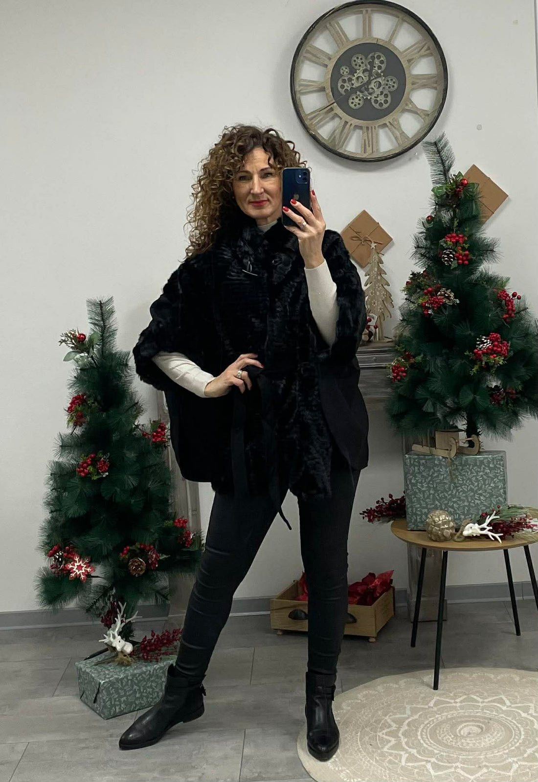 Pille - Szőrmés ponchó kabát. Fekete