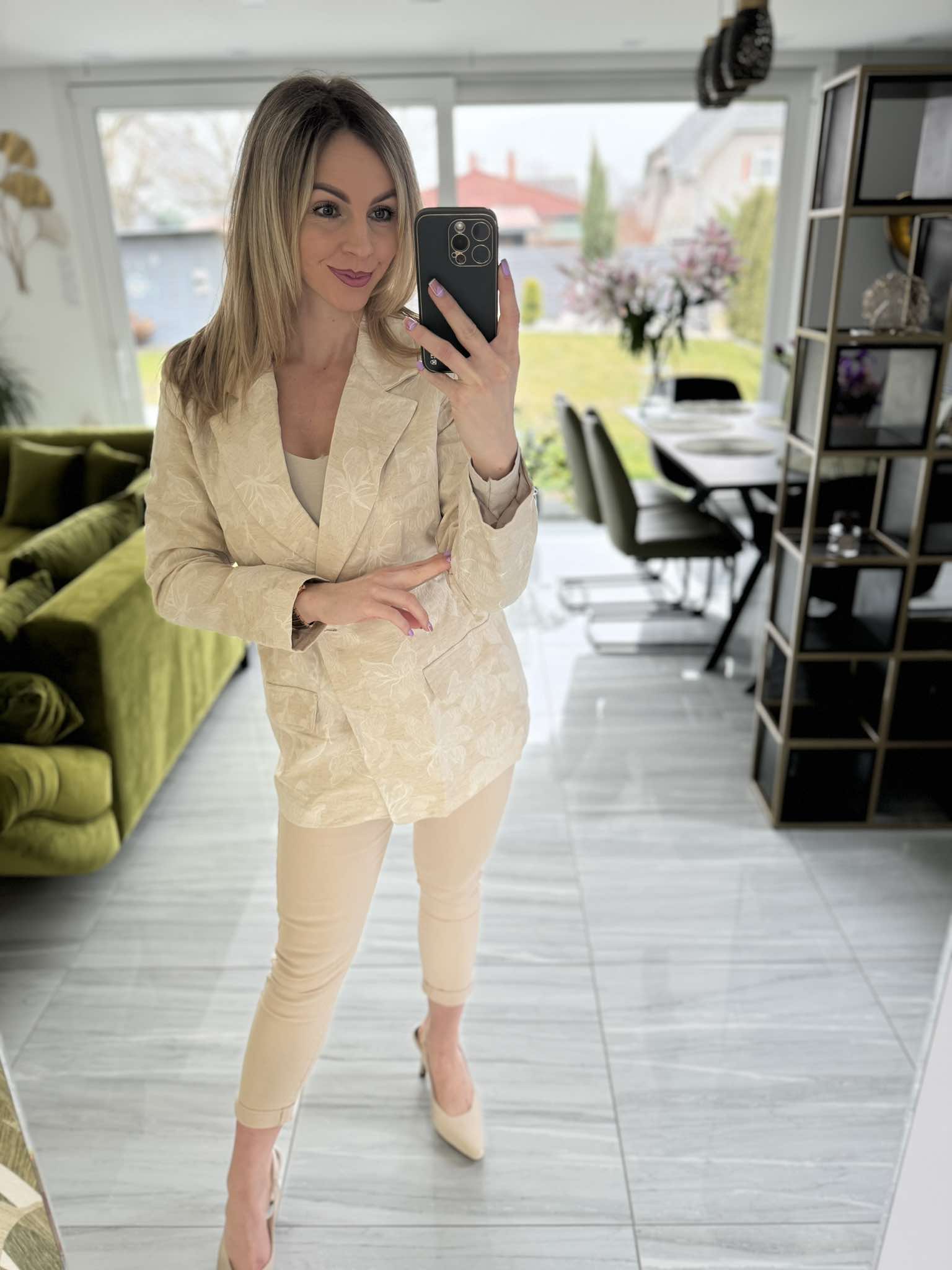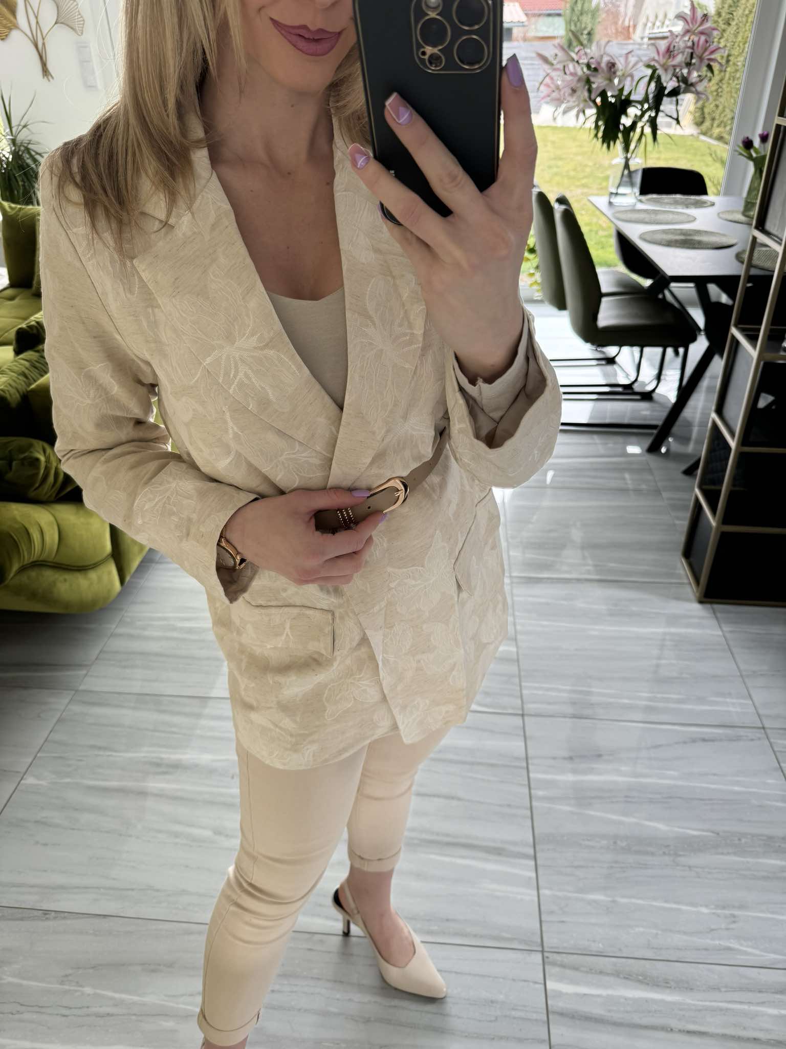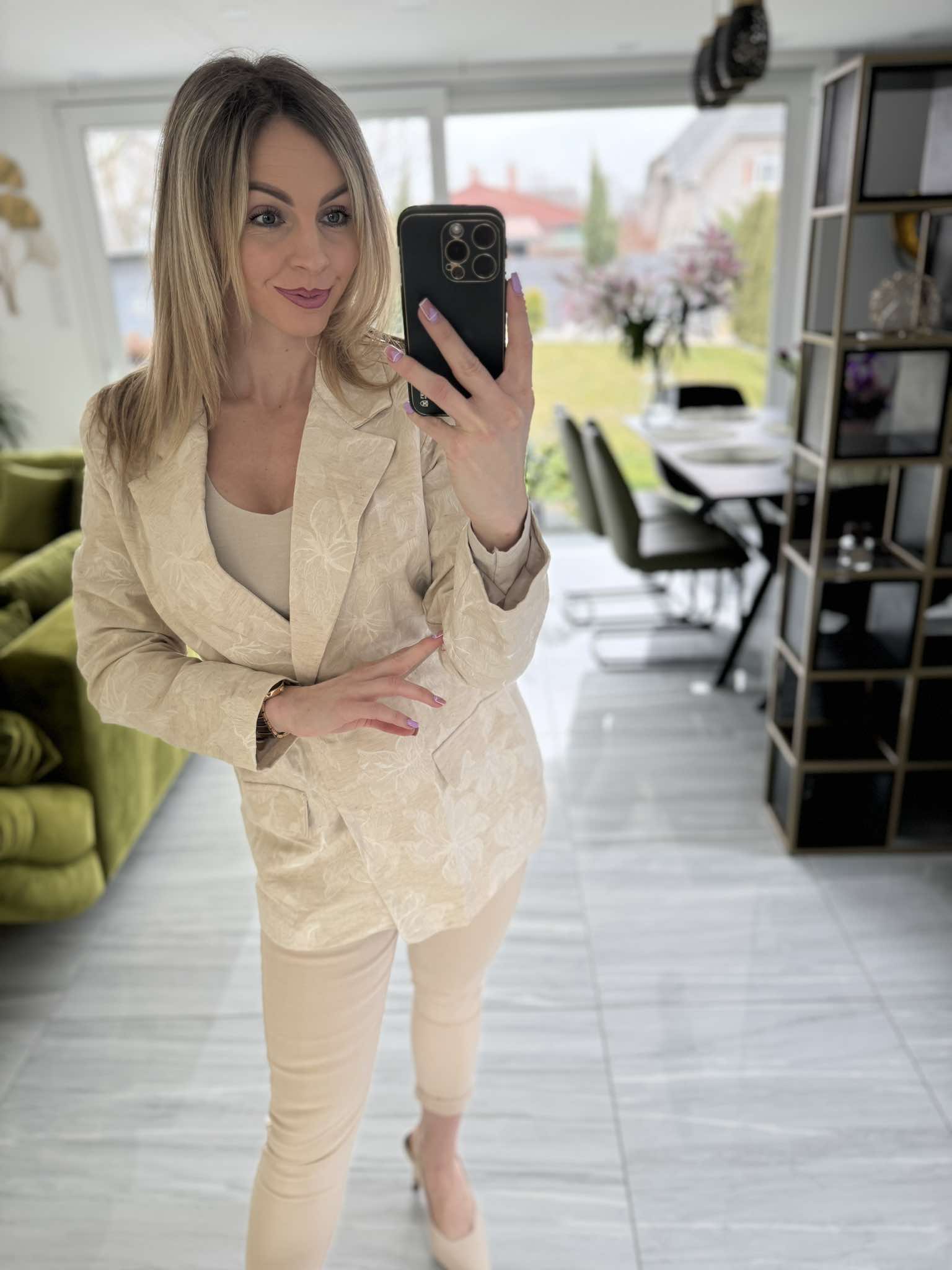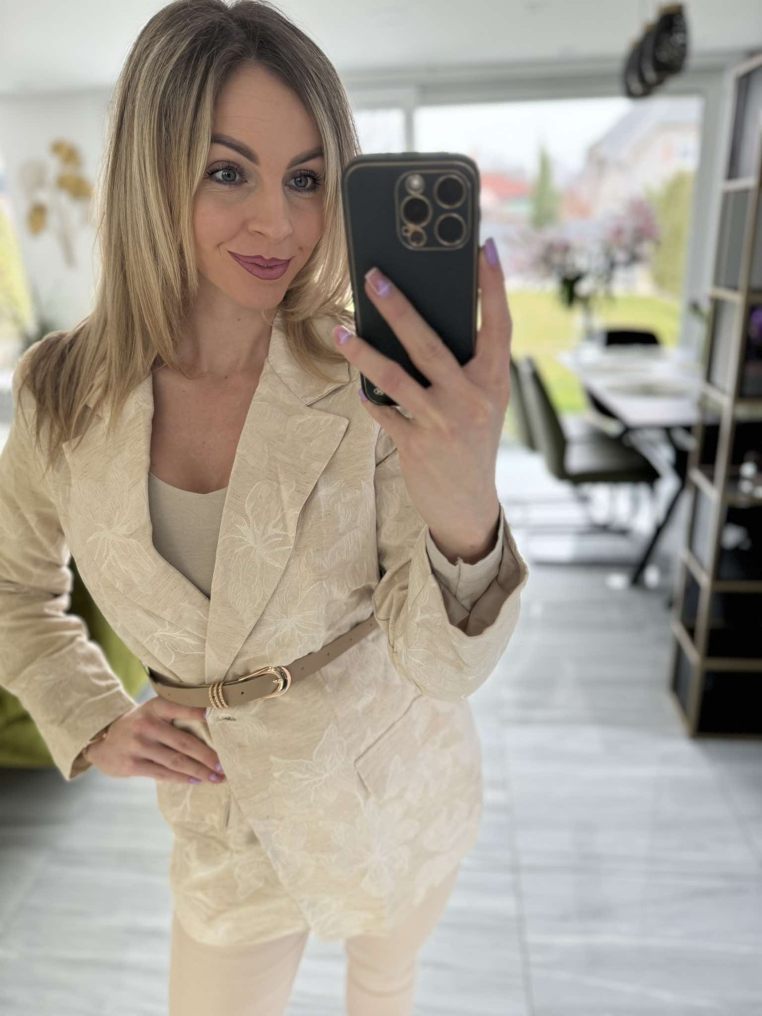 Ez a bézs zakó elegáns, virágmintás anyagával és övvel hangsúlyozott derekával nőies és kifinomult megjelenést kölcsönöz. Tökéletes választás irodai viselethez vagy különleges alkalmakra is.