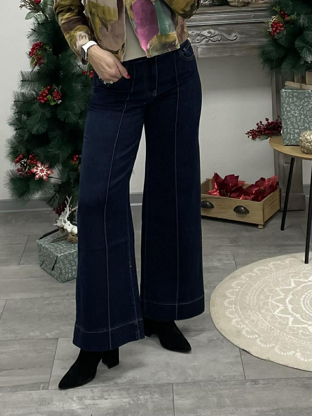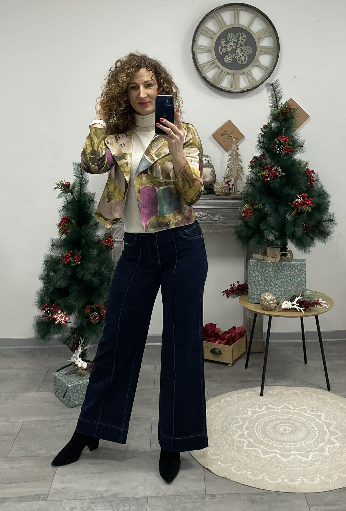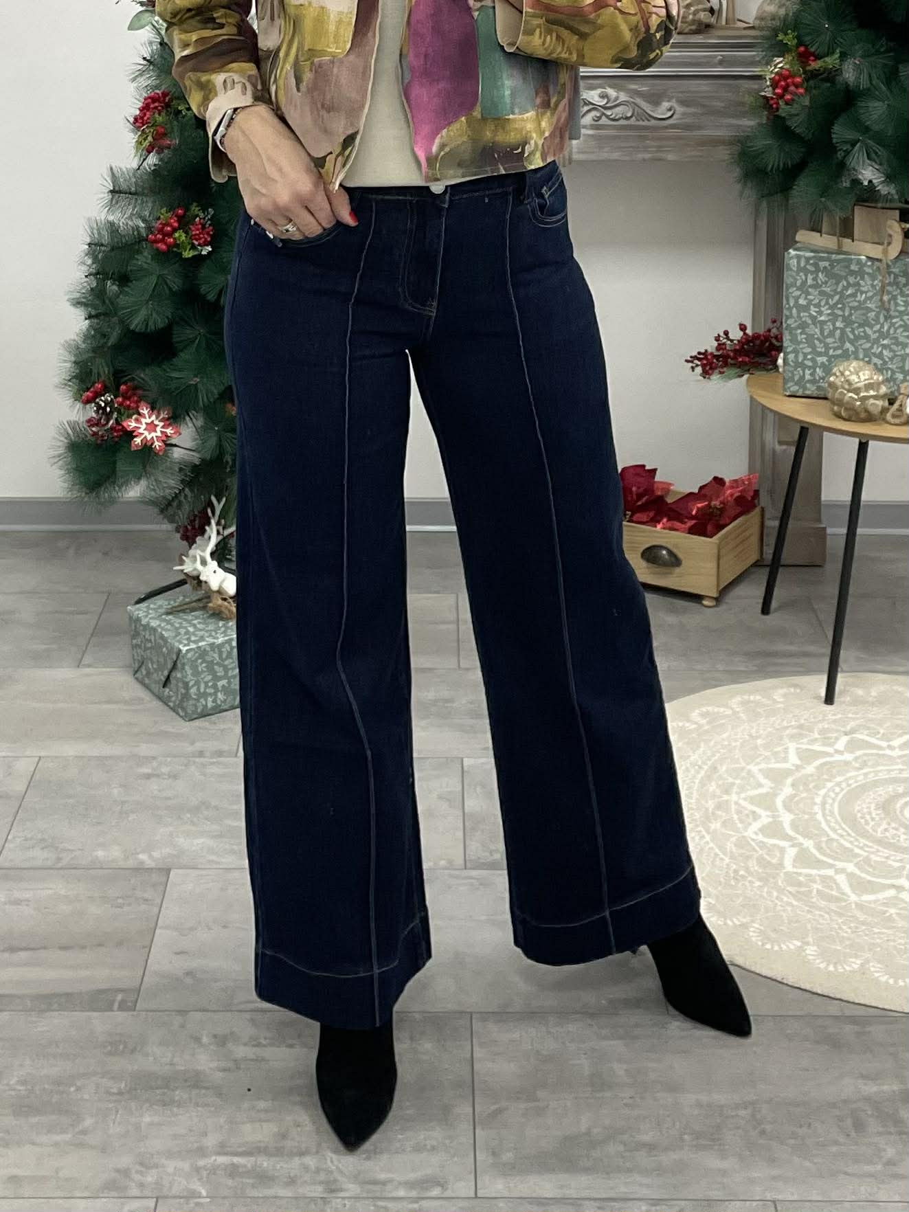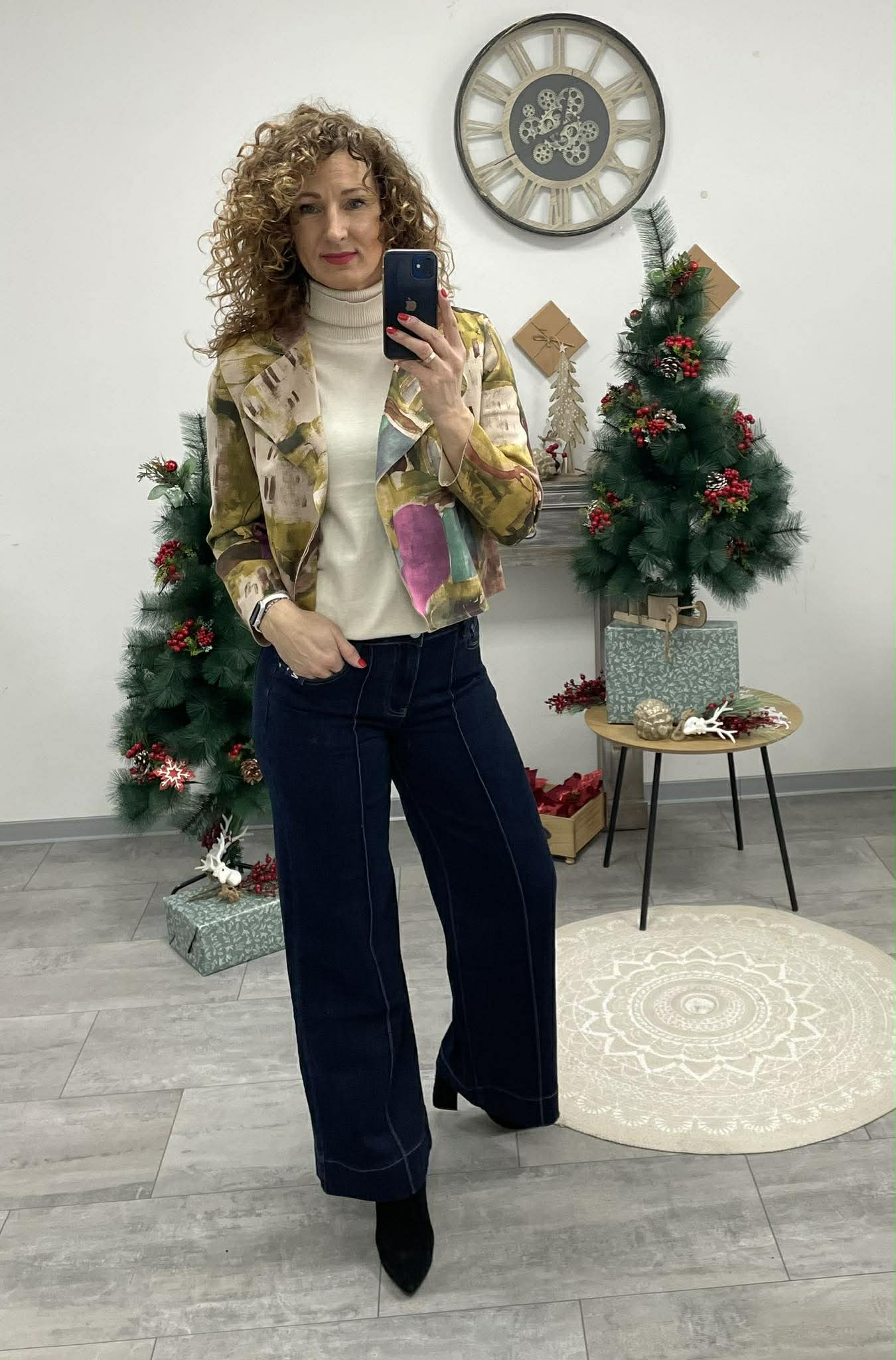 Az elöl tűzött varrás optikailag nyújtja az alakot, míg az alul széles felhajtás trendi, karakteres megjelenést ad.