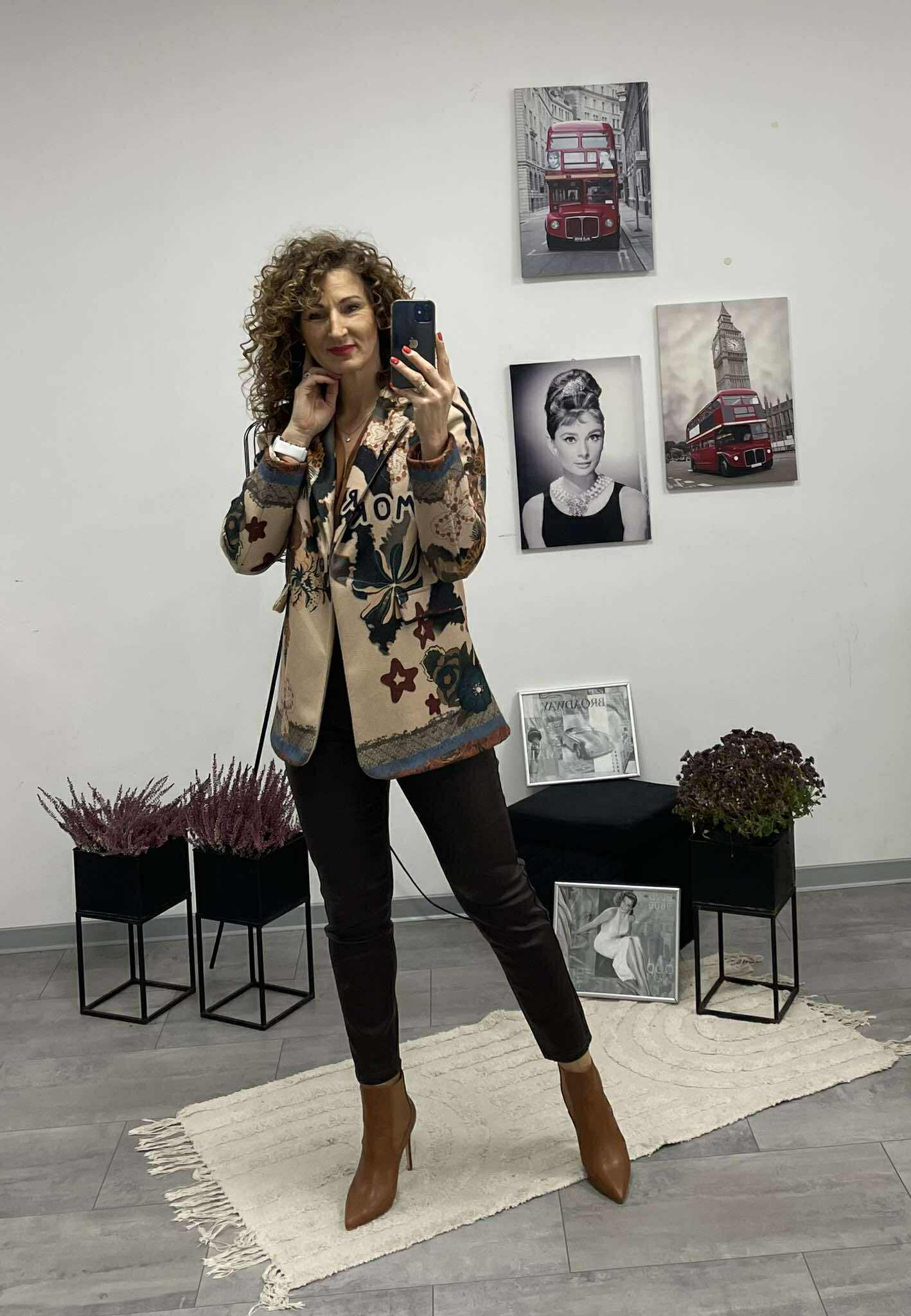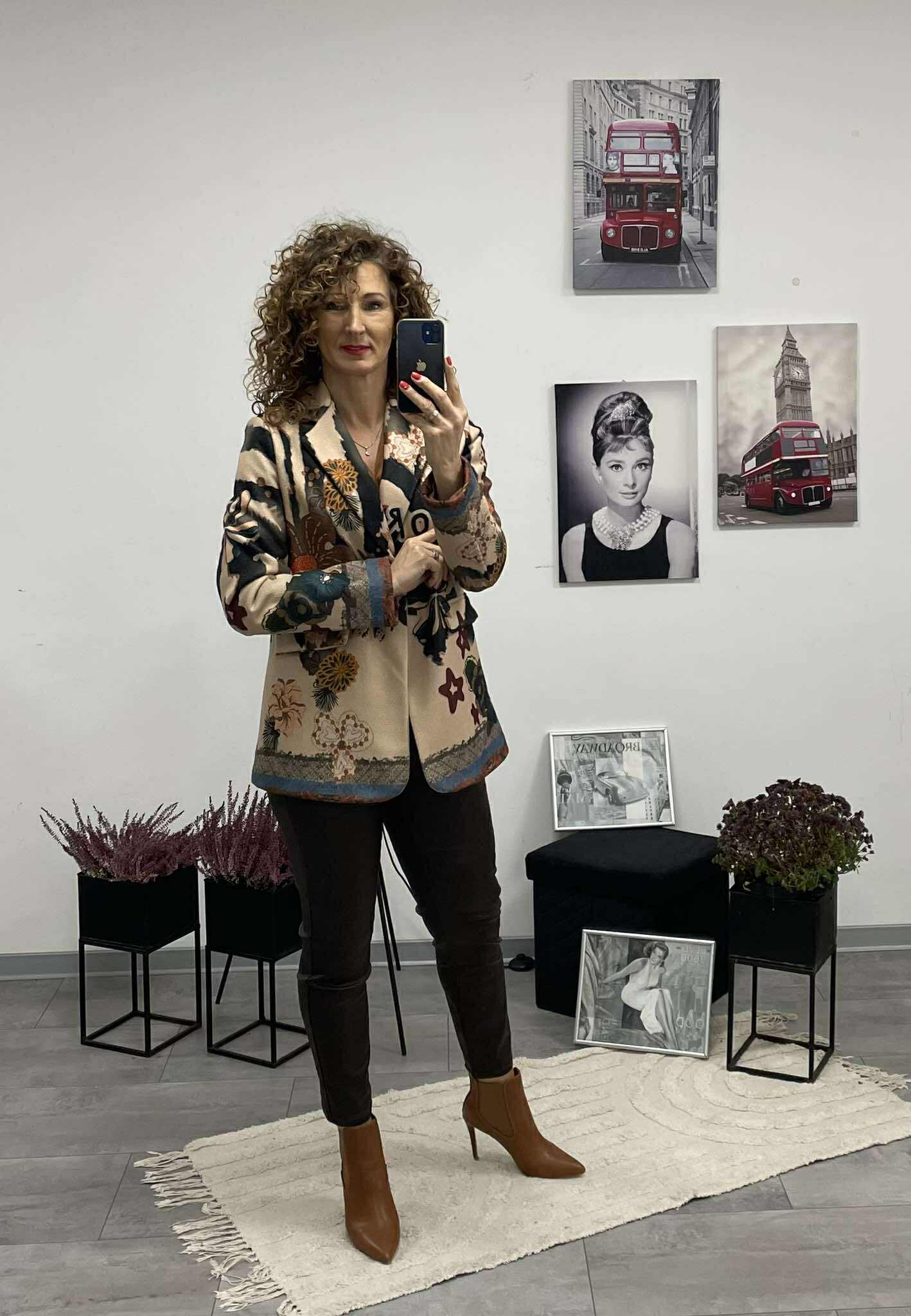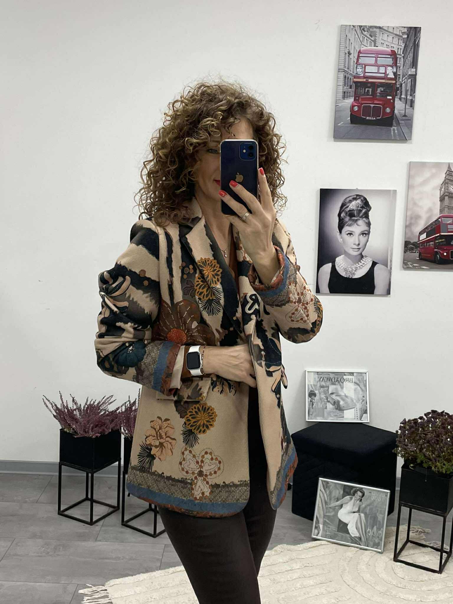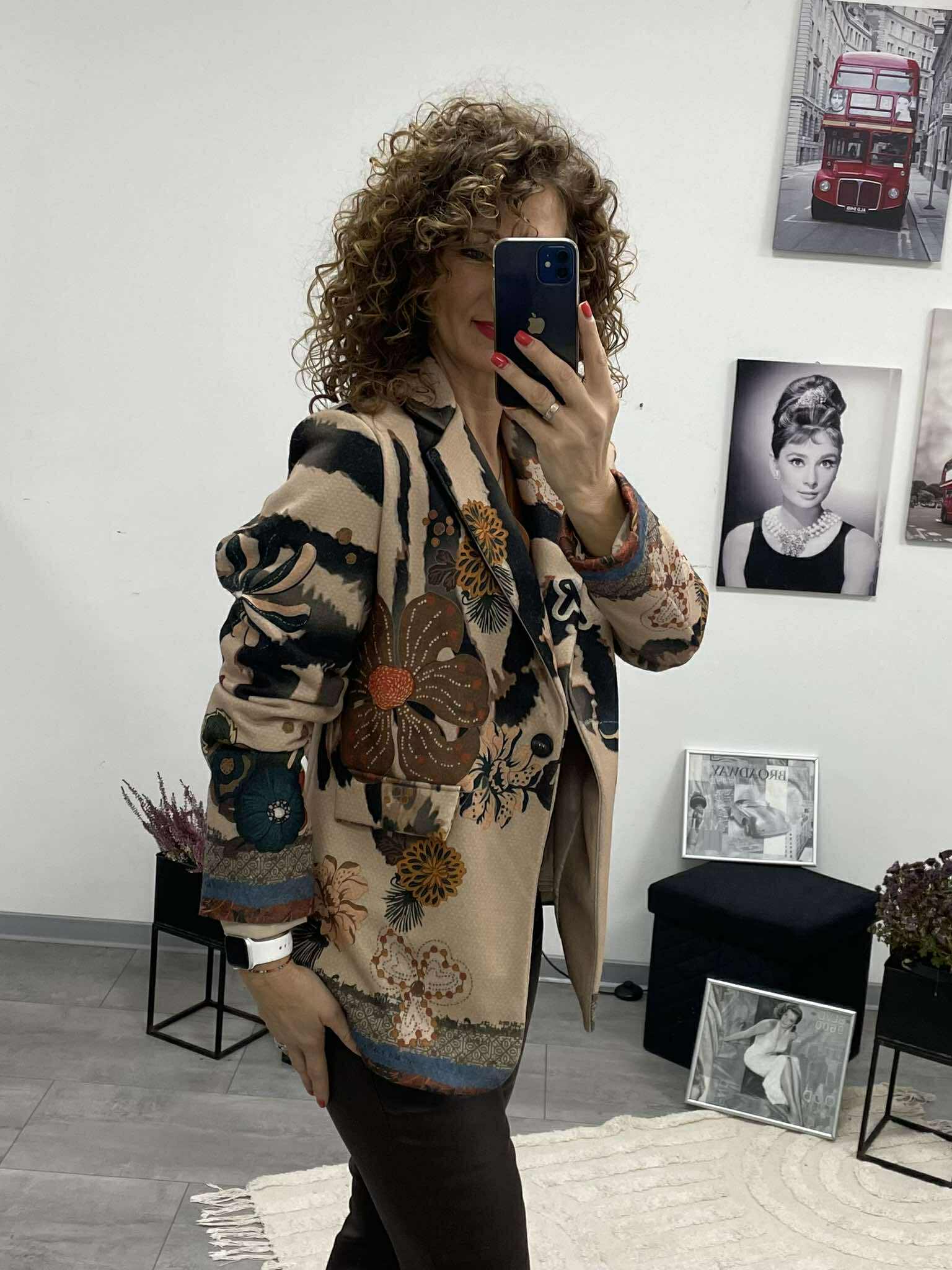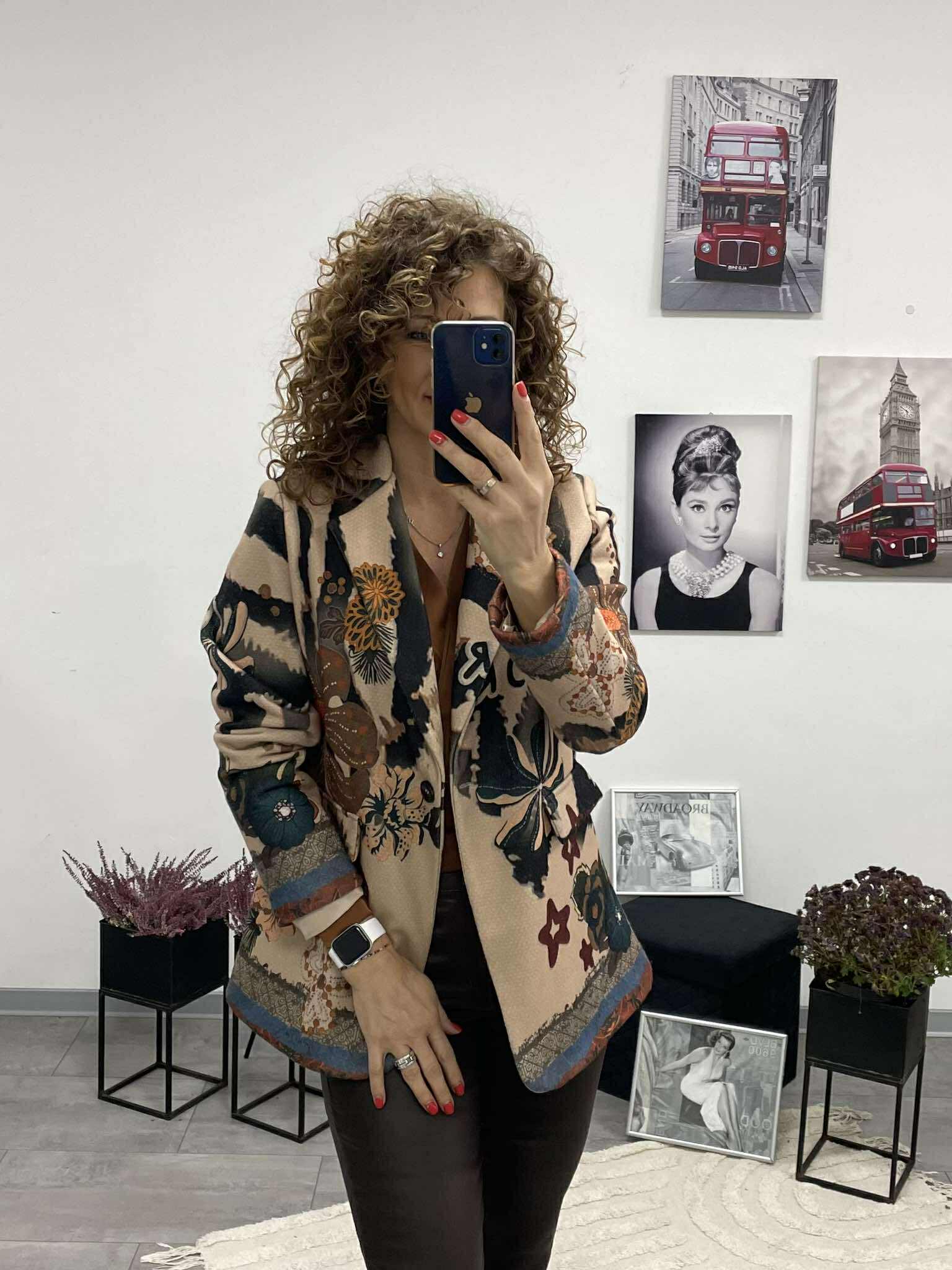 Ez az átmeneti, sportos blézer igazán különleges darab azoknak, akik szeretik az egyediséget és a kényelmes eleganciát. Feltűnő, egyedi mintázata azonnal magára vonja a tekintetet, miközben enyhén bélelt kialakítása kellemes tartást és kényelmes viseletet biztosít.
