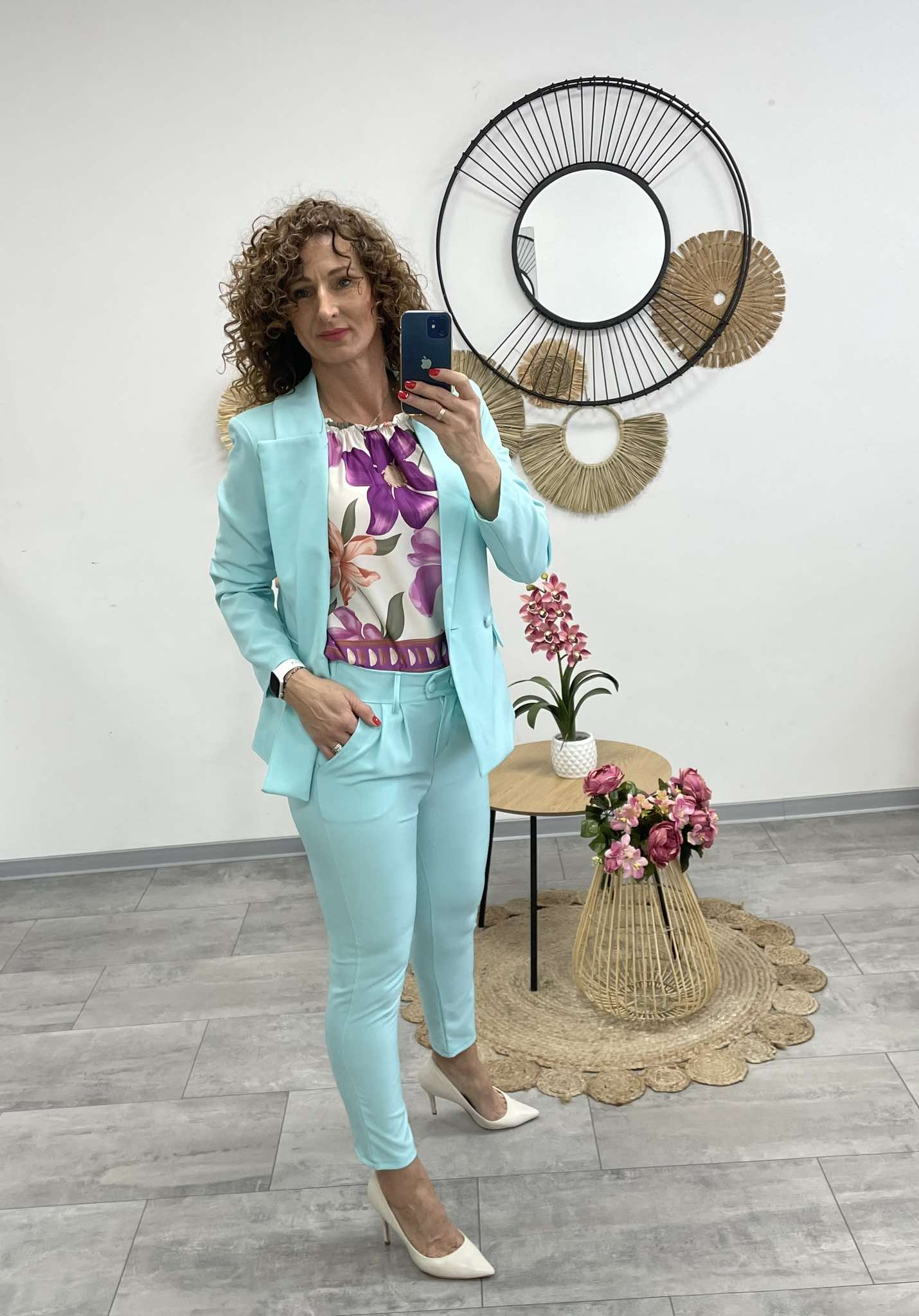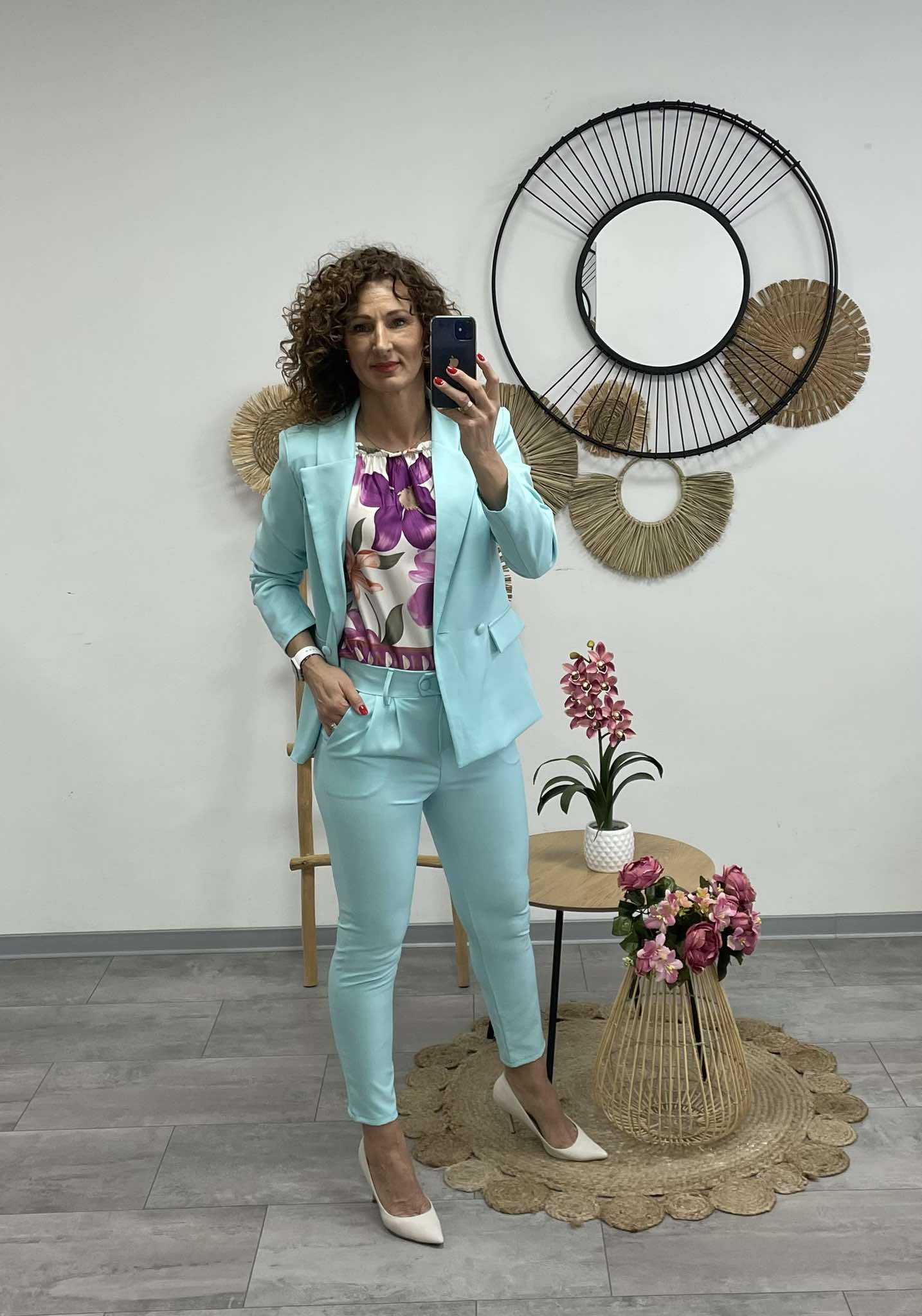 Elegáns, világos bézs nadrágkosztüm, mely letisztult szabású zakóból és karcsúsított, magas derekú nadrágból áll. Tökéletes választás irodai megjelenéshez vagy alkalmi eseményekre, ha a stílus és a kifinomultság egyszerre fontos számodra.