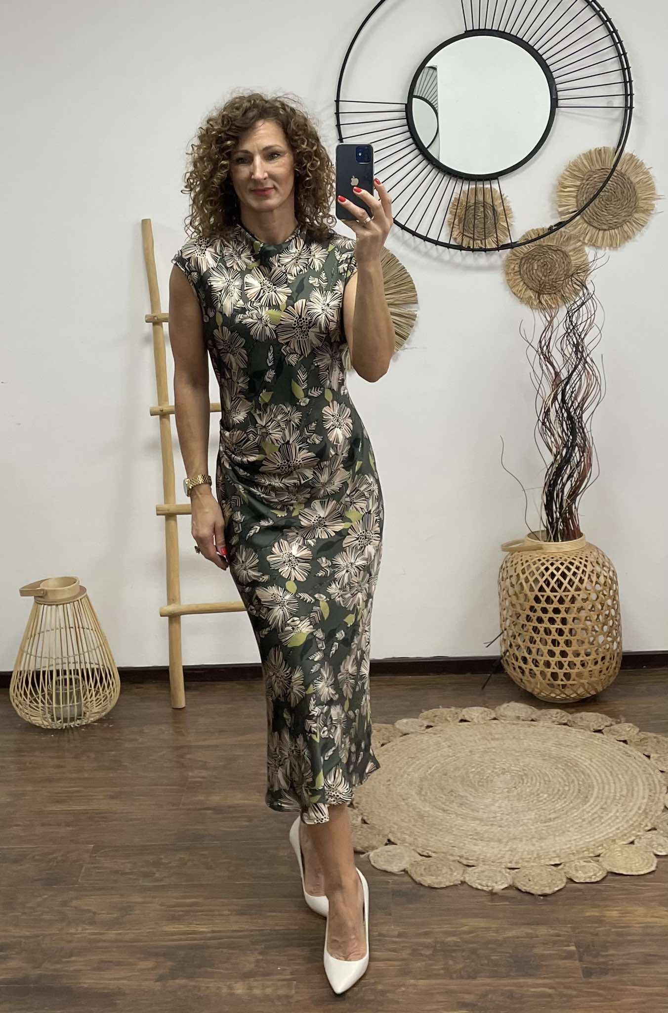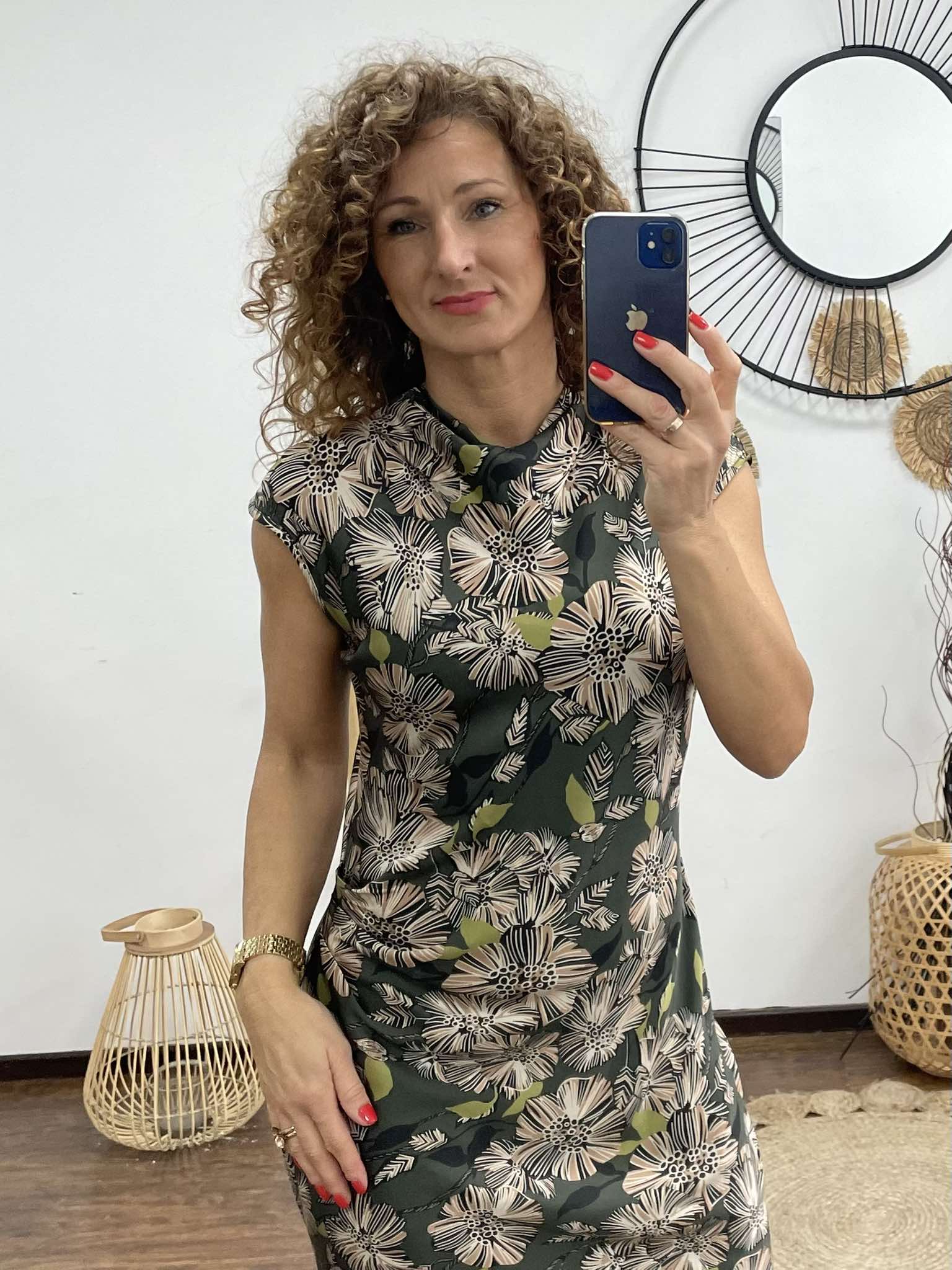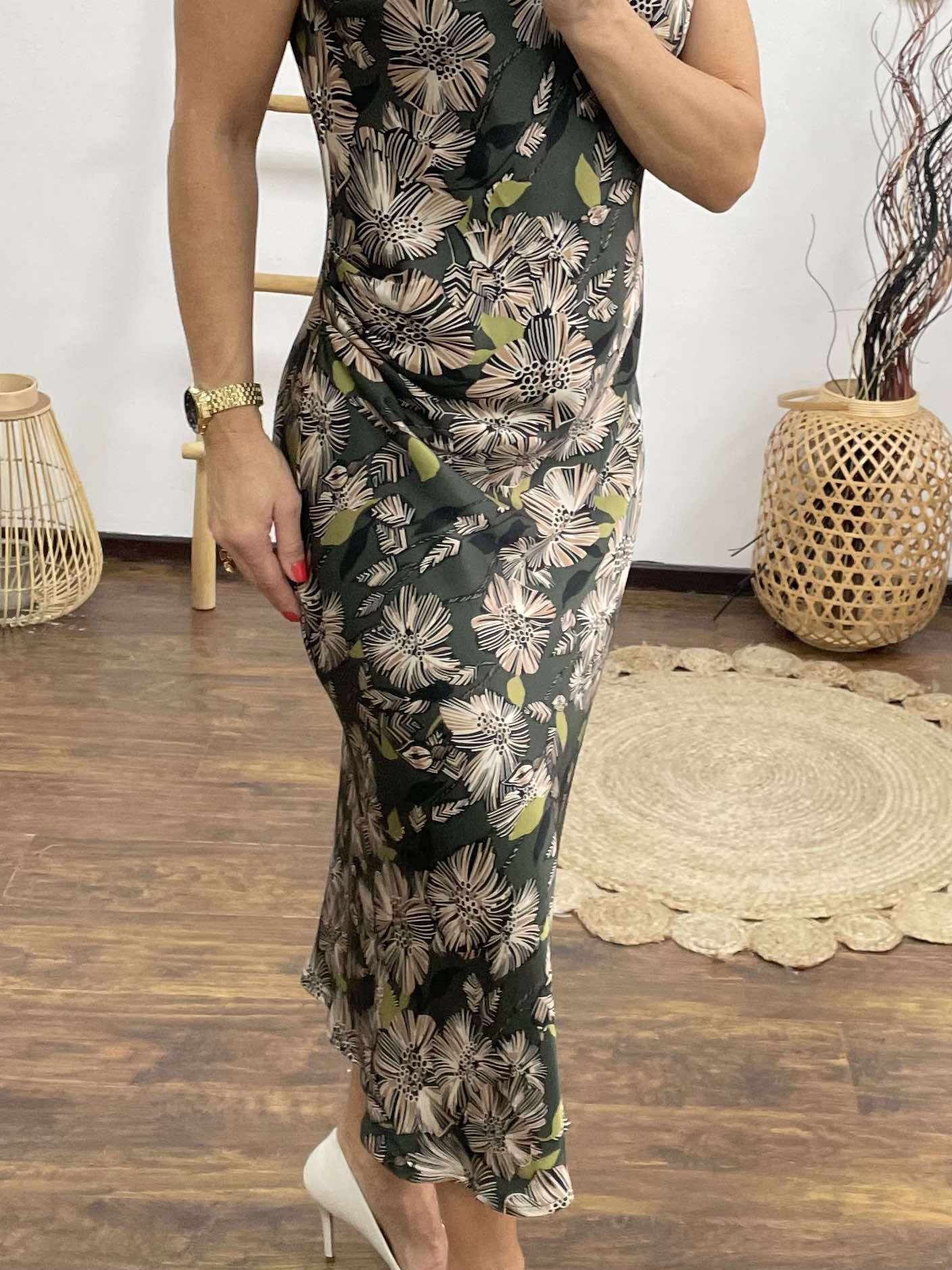 Elegáns, nőies ruha selymes esésű anyagból, csodás virágmintával díszítve. A test vonalát finoman követő szabás és a nyaknál kialakított lágy redőzés különleges karaktert ad a megjelenésnek. Ujjatlan fazonja miatt ideális választás tavaszi-nyári alkalmakra, de egy finom kardigánnal ősszel is viselhető. Letisztult, mégis figyelemfelkeltő darab, amely a természet ihlette mintáival tökéletesen ötvözi az eleganciát és a könnyedséget.