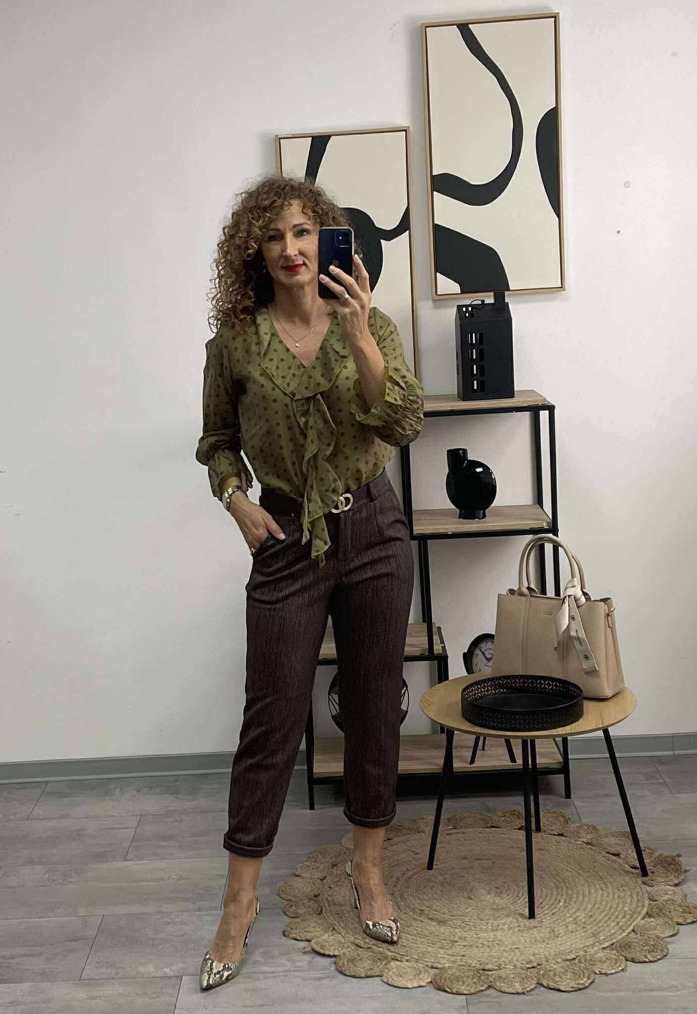 Elegáns nadrág, különleges fényes anyagból, modern övvel kiegészítve. A letisztult szabás és a kényelmes fazon miatt ideális választás munkába, rendezvényre vagy akár egy stílusos hétköznapi szetthez is.