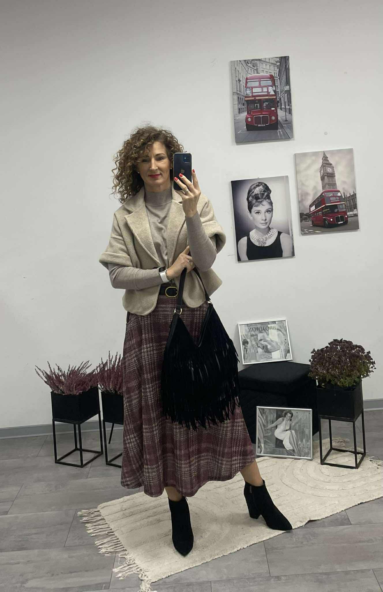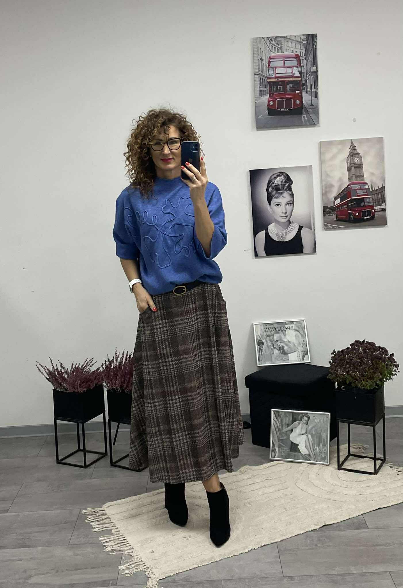 A szoknya klasszikus mintája könnyen kombinálható, legyen szó csizmáról, pulóverről vagy elegánsabb felsőről. Tökéletes választás kényelmes, mégis csinos hétköznapi szettekhez.