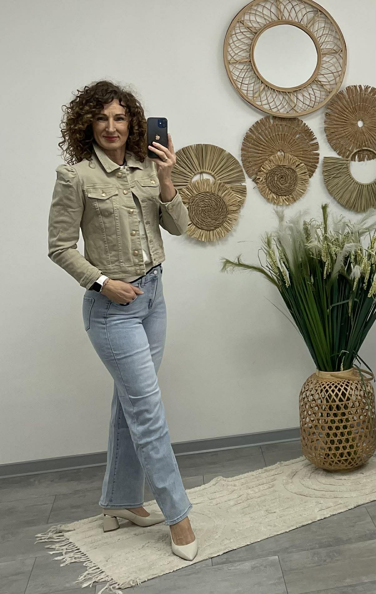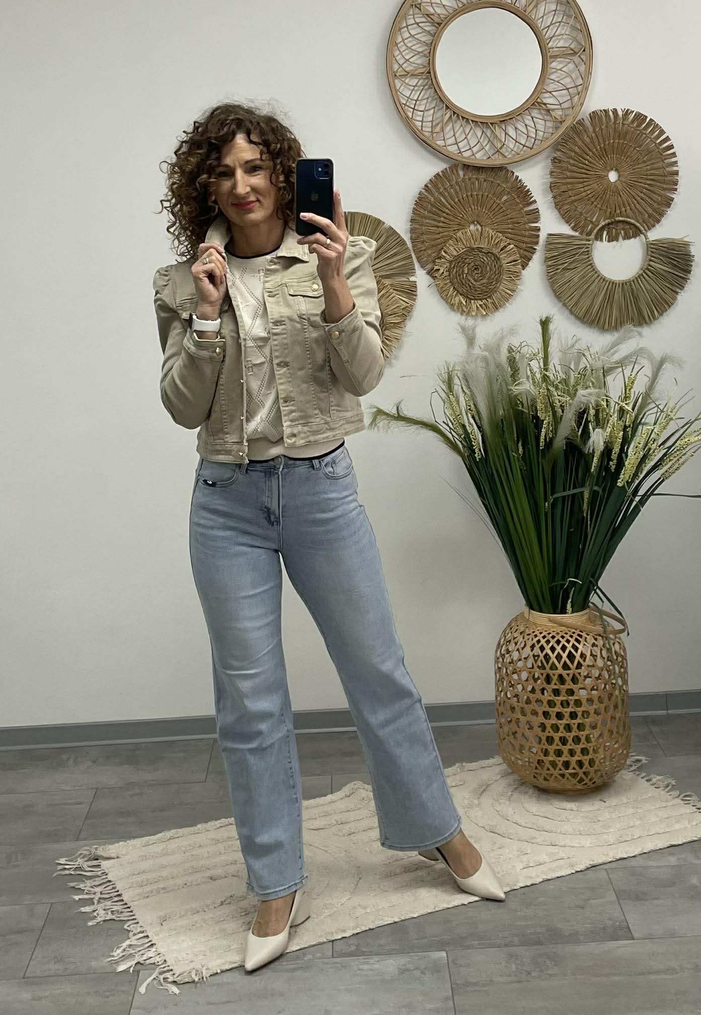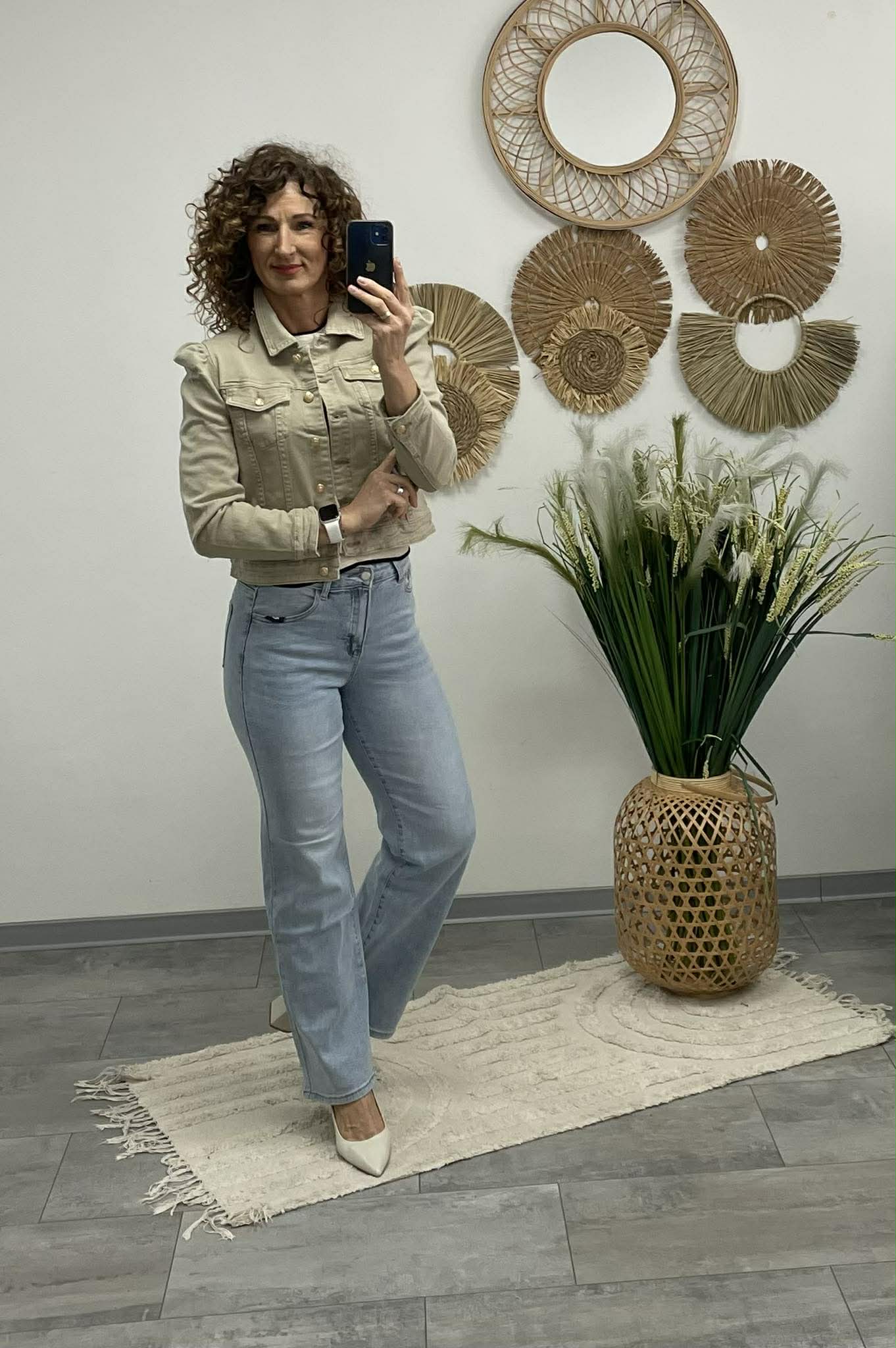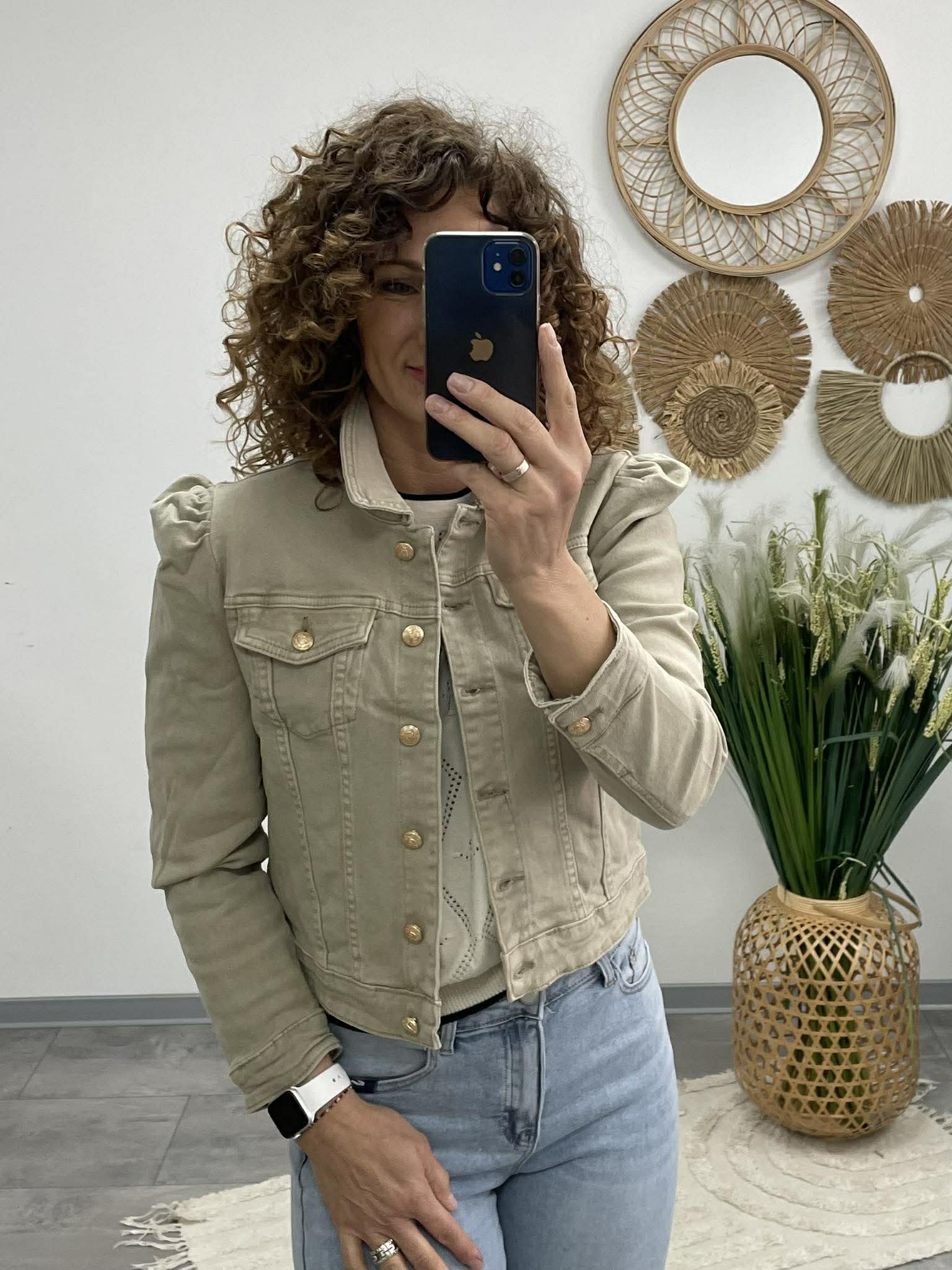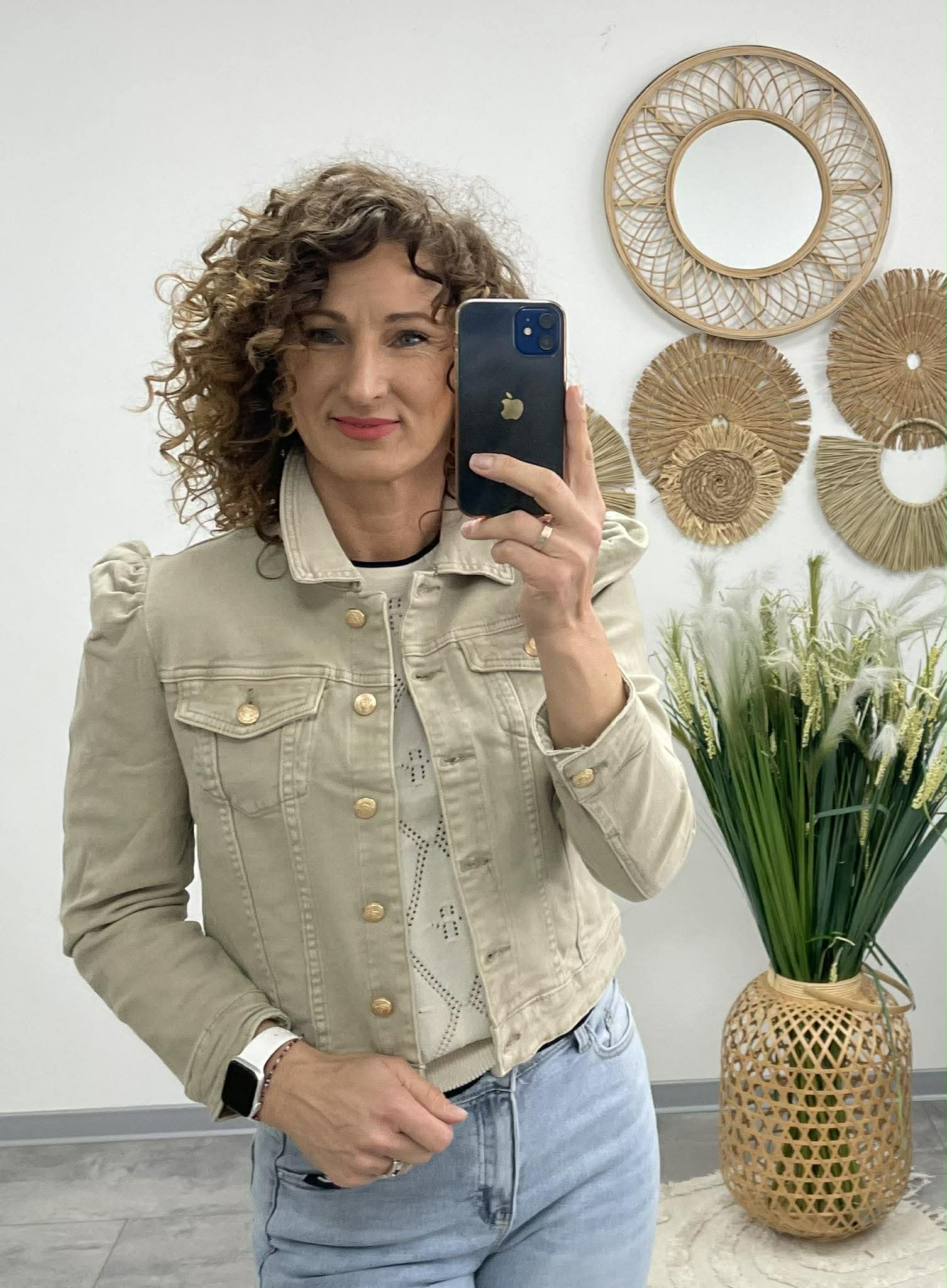 Divatos farmer dzseki, amely nőies és karakteres megjelenést kölcsönöz. A rakott váll kialakítás különleges, trendi hatást ad, míg az arany díszgombok elegáns részletekkel emelik ki a darabot. Tökéletes választás, ha egy stílusos, mégis könnyen kombinálható kabátot keresel.