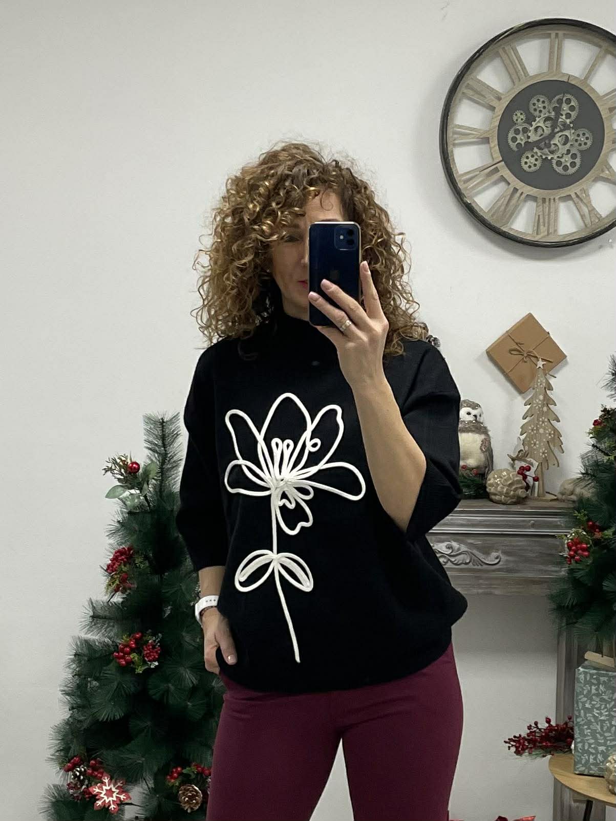 Oversize kötött pulóver – igazán kényelmes és trendi darab, amely a lezser fazonjával bármilyen alkaton jól mutat. A nagy virágminta játékosságot visz az outfitbe, így könnyedén stílusos és egyedi lehetsz a mindennapokban! 🌸✨