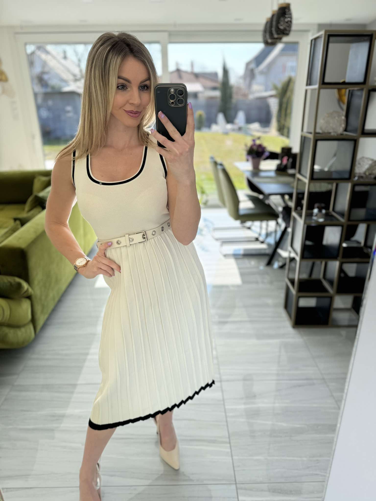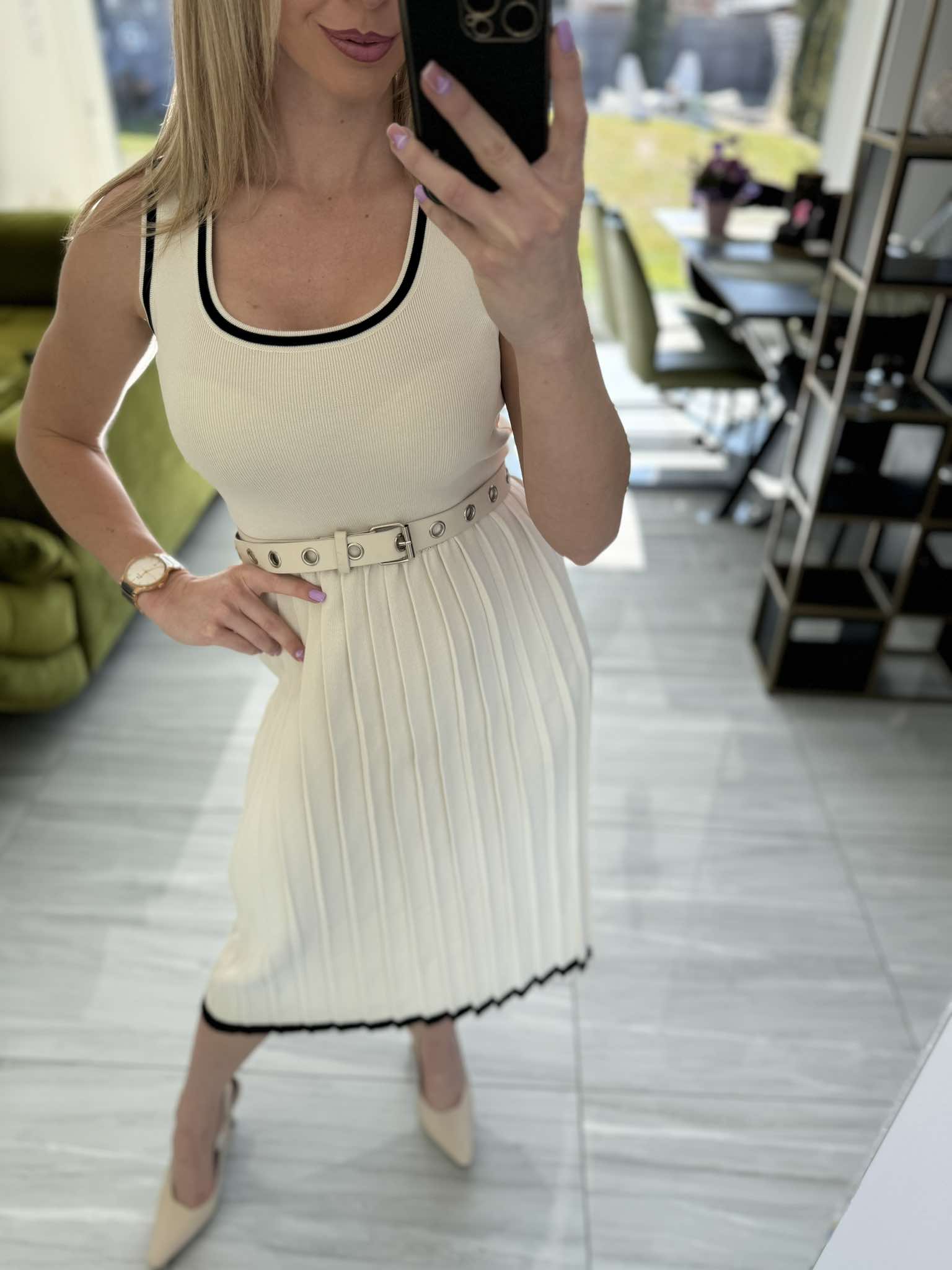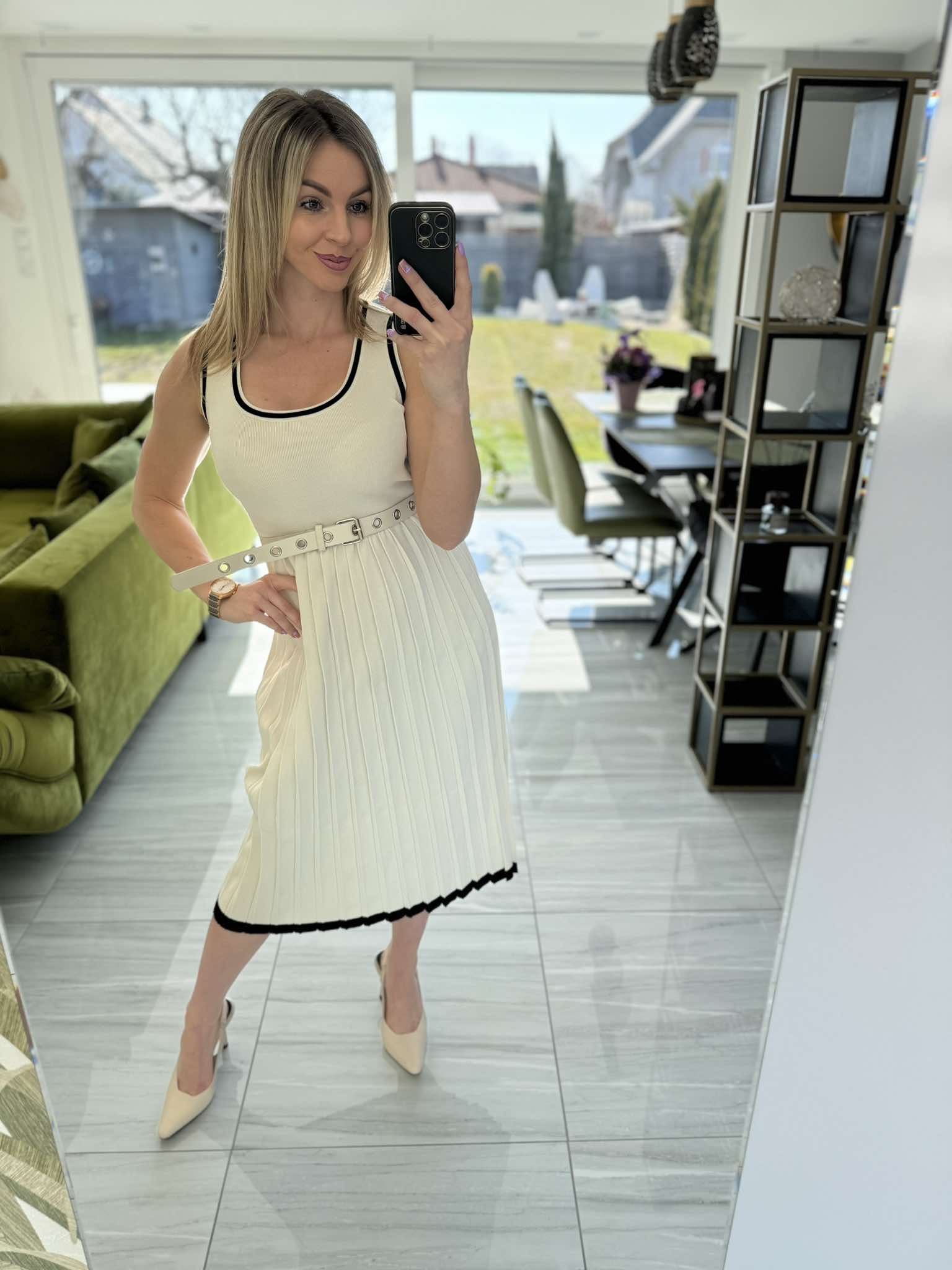 Ez az elegáns, ujjatlan ruha enyhén pliszírozott szoknyarésze és kontrasztos fekete szegélyei igazán nőies megjelenést kölcsönöznek. A derékrészt öv hangsúlyozza, ami még csinosabb sziluettet biztosít.