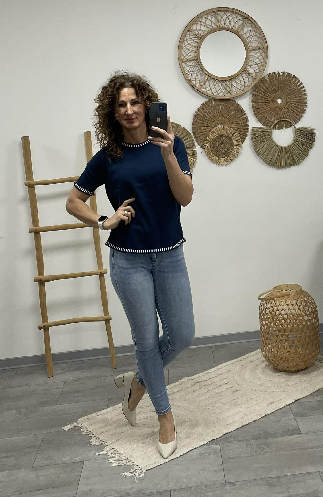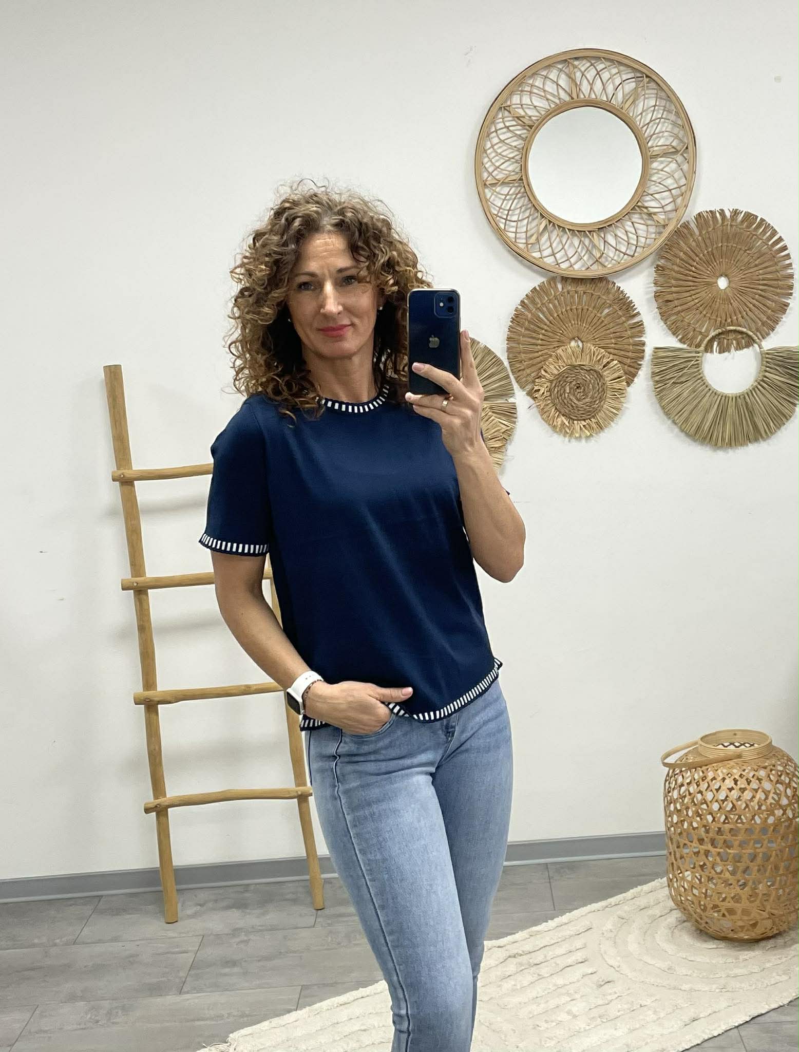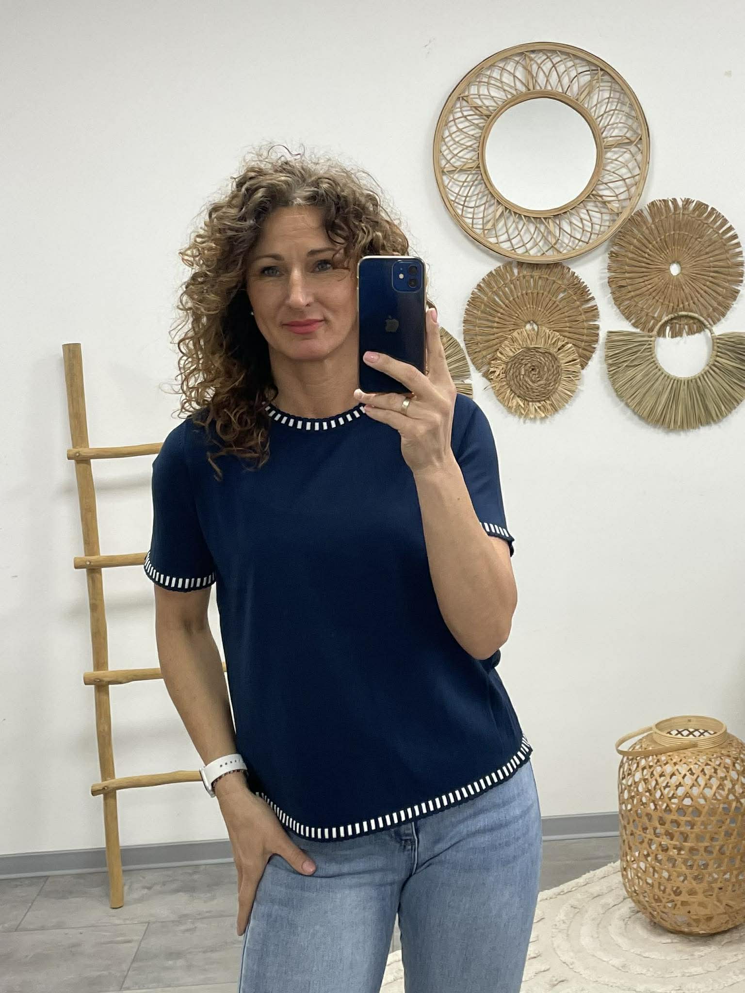 Puha, kényelmes kötött anyagból készült felső, klasszikus kerek nyakkal.