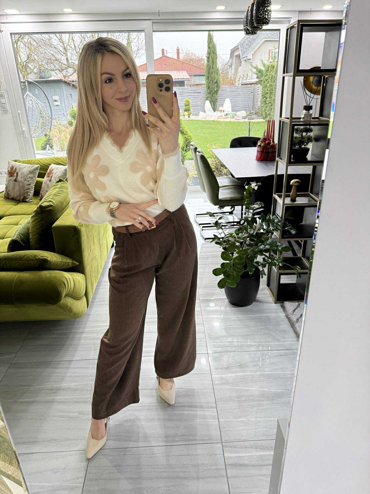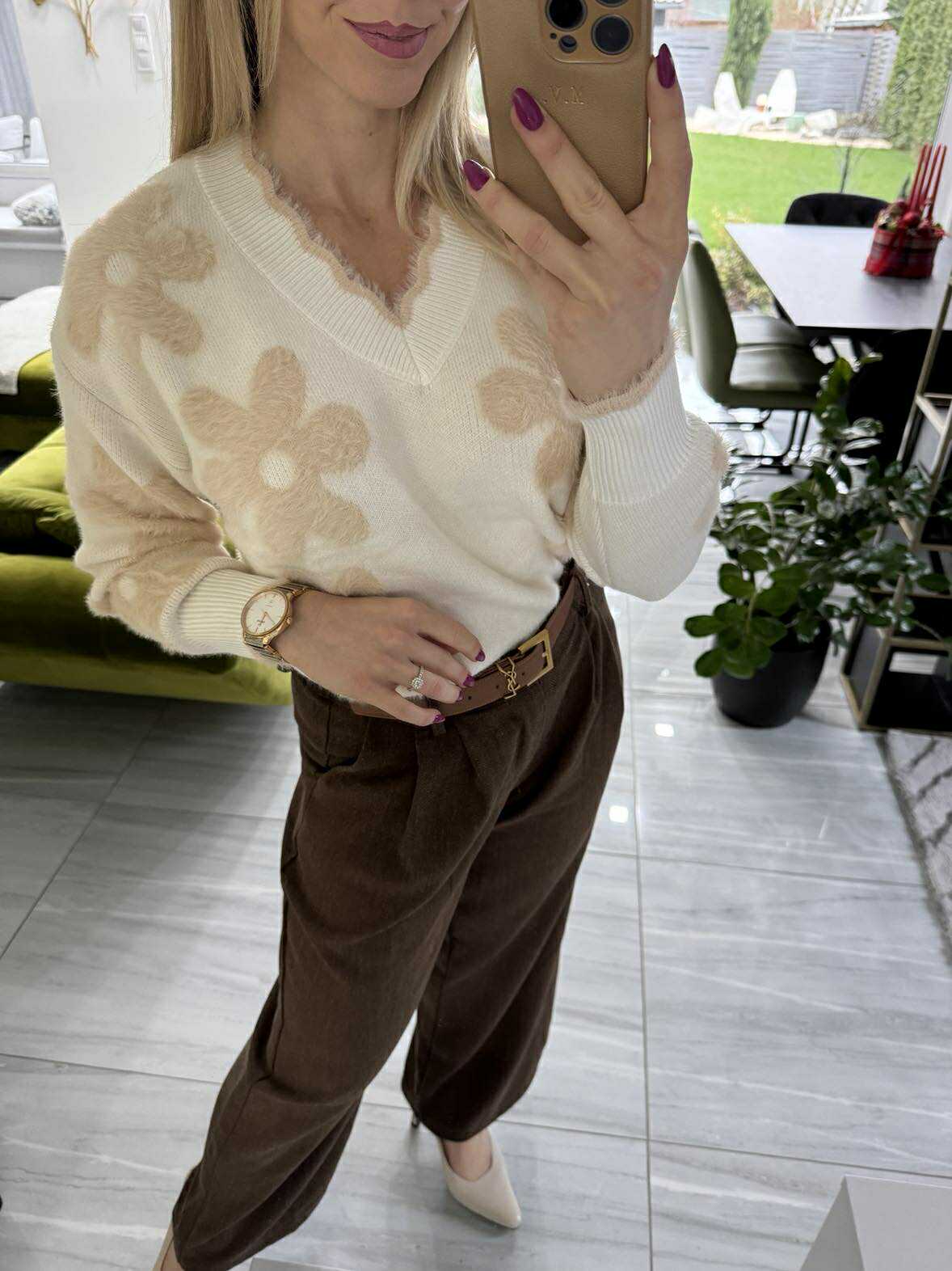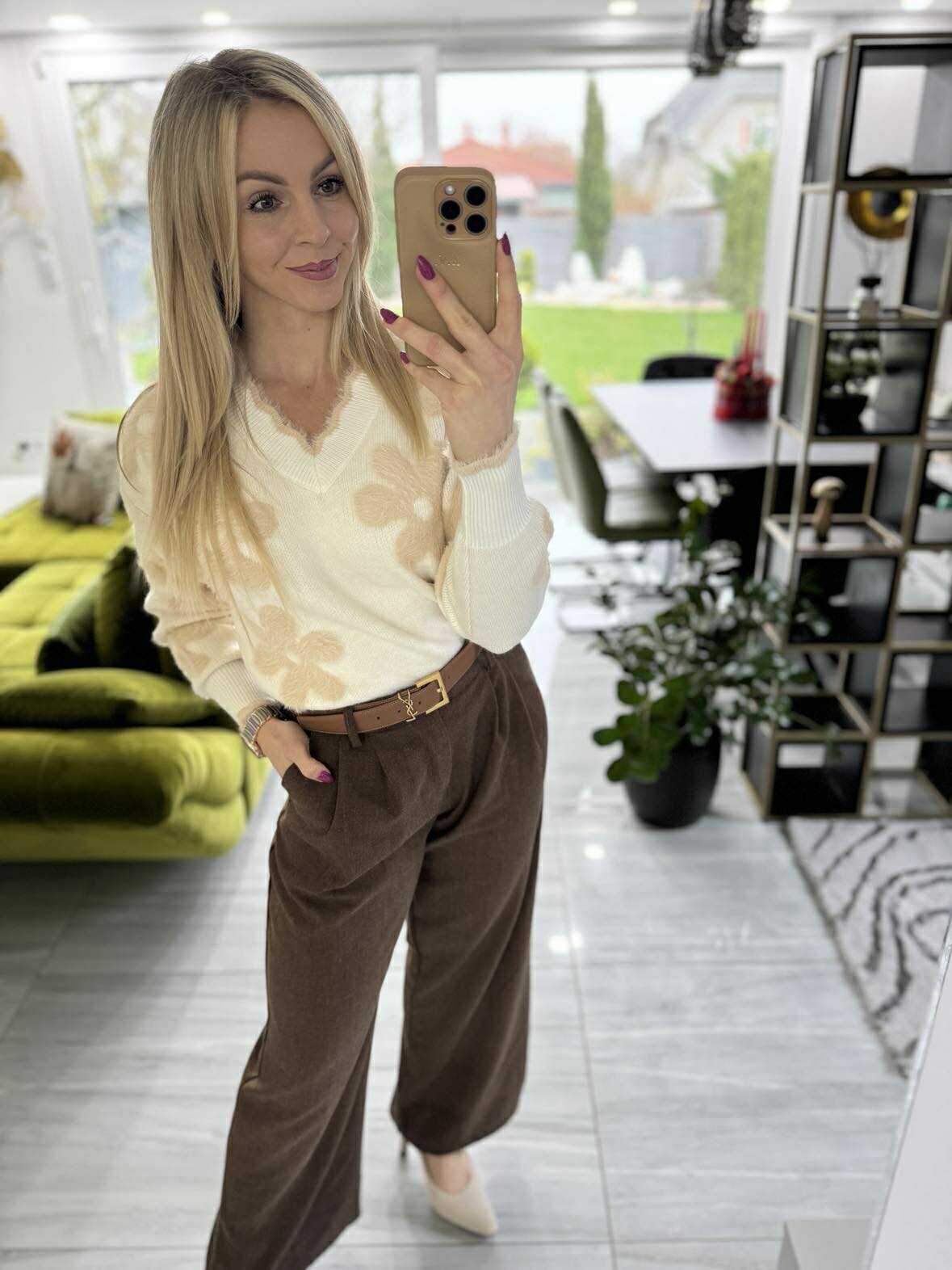 Puha, meleg kötött anyagból készült pulóver, bájos 3D virágmintával díszítve. A kifinomult, bolyhos részletek extra nőiességet adnak minden szettedhez! 🌸✨