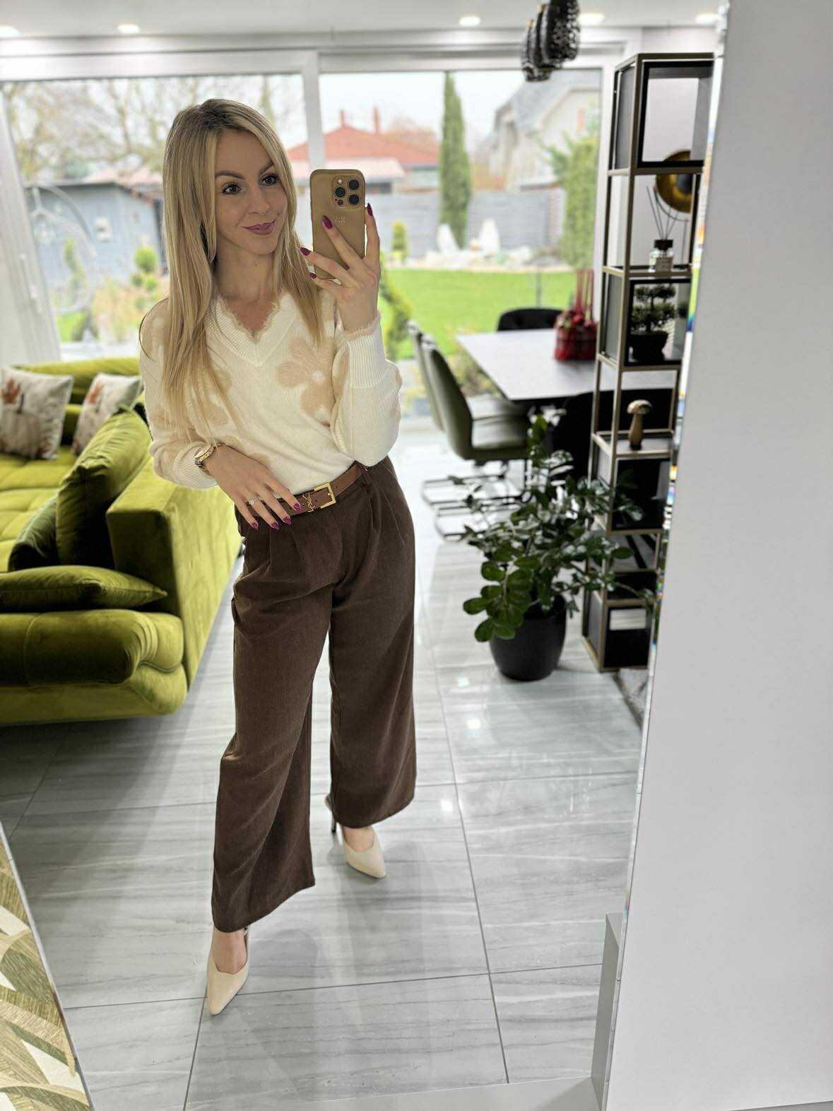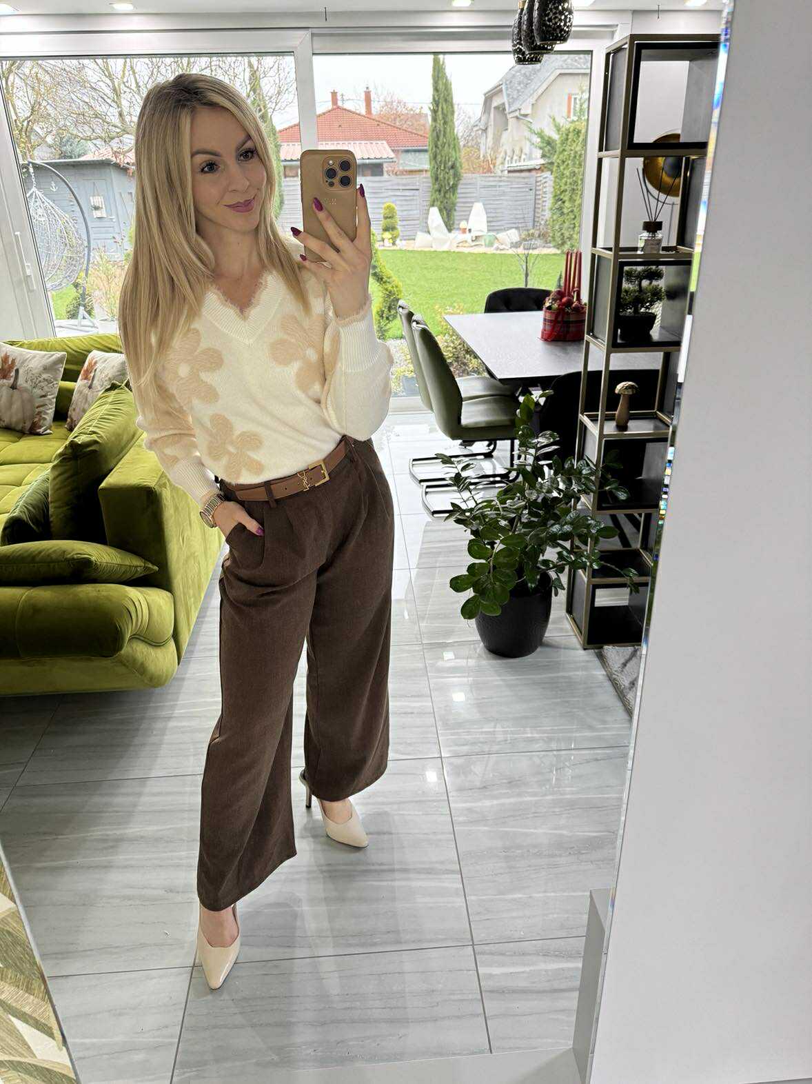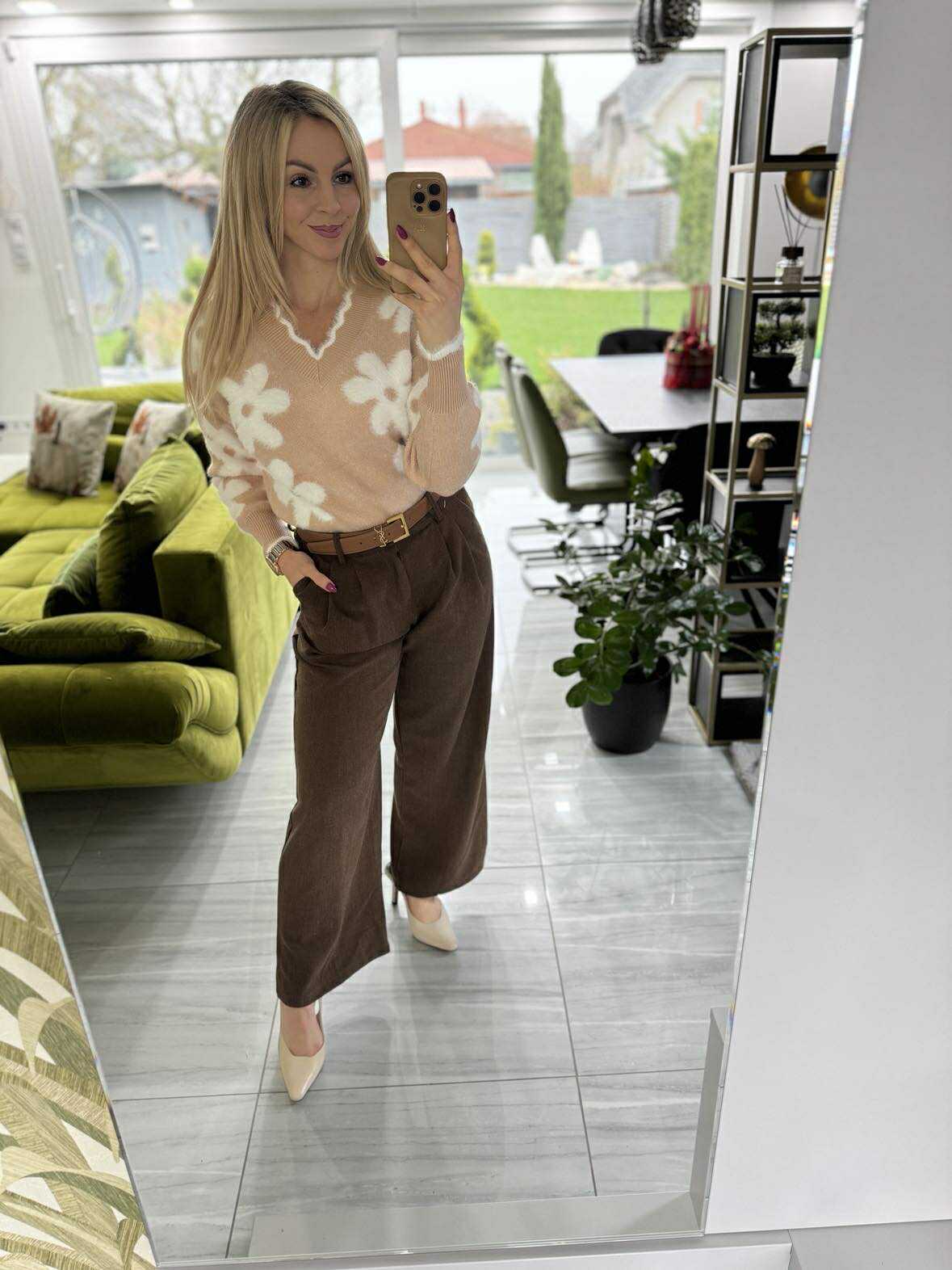 Puha, meleg kötött anyagból készült pulóver, bájos 3D virágmintával díszítve. A kifinomult, bolyhos részletek extra nőiességet adnak minden szettedhez! 🌸✨