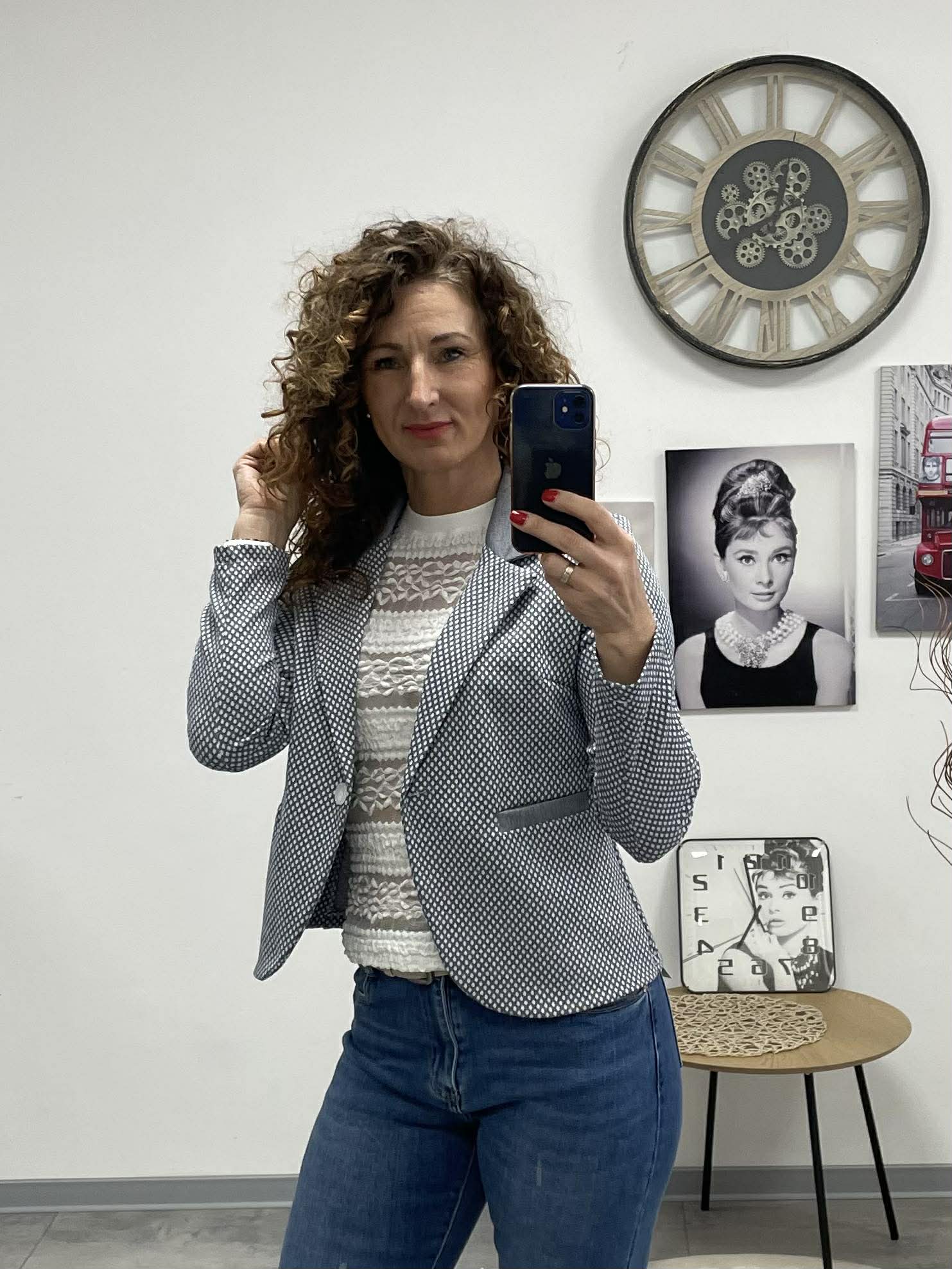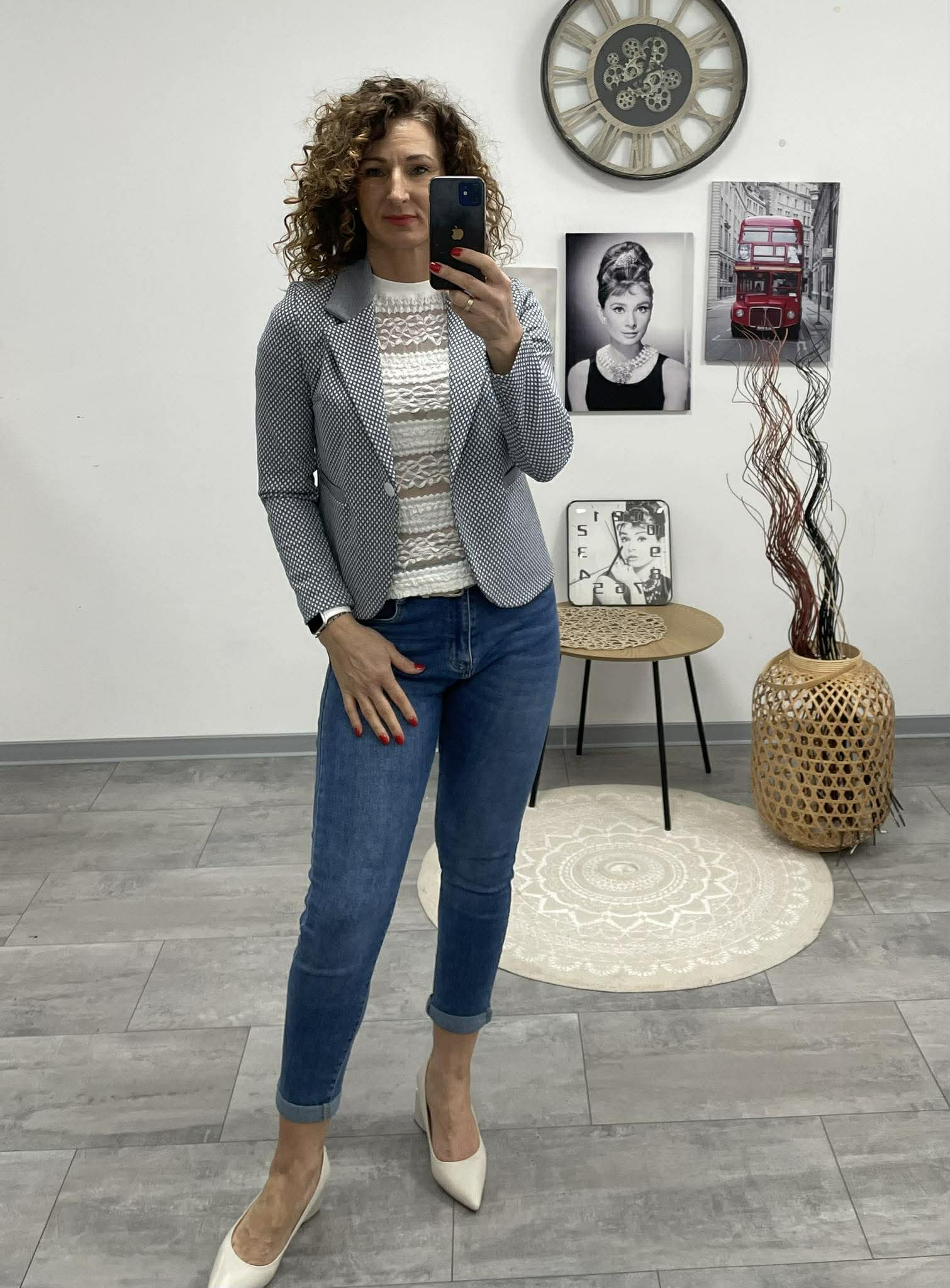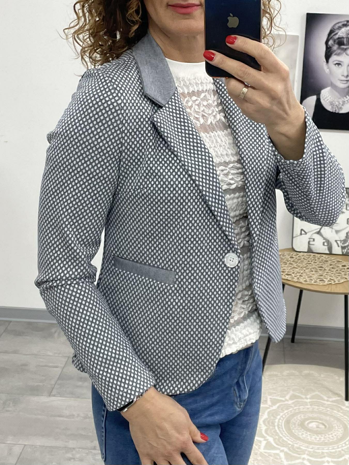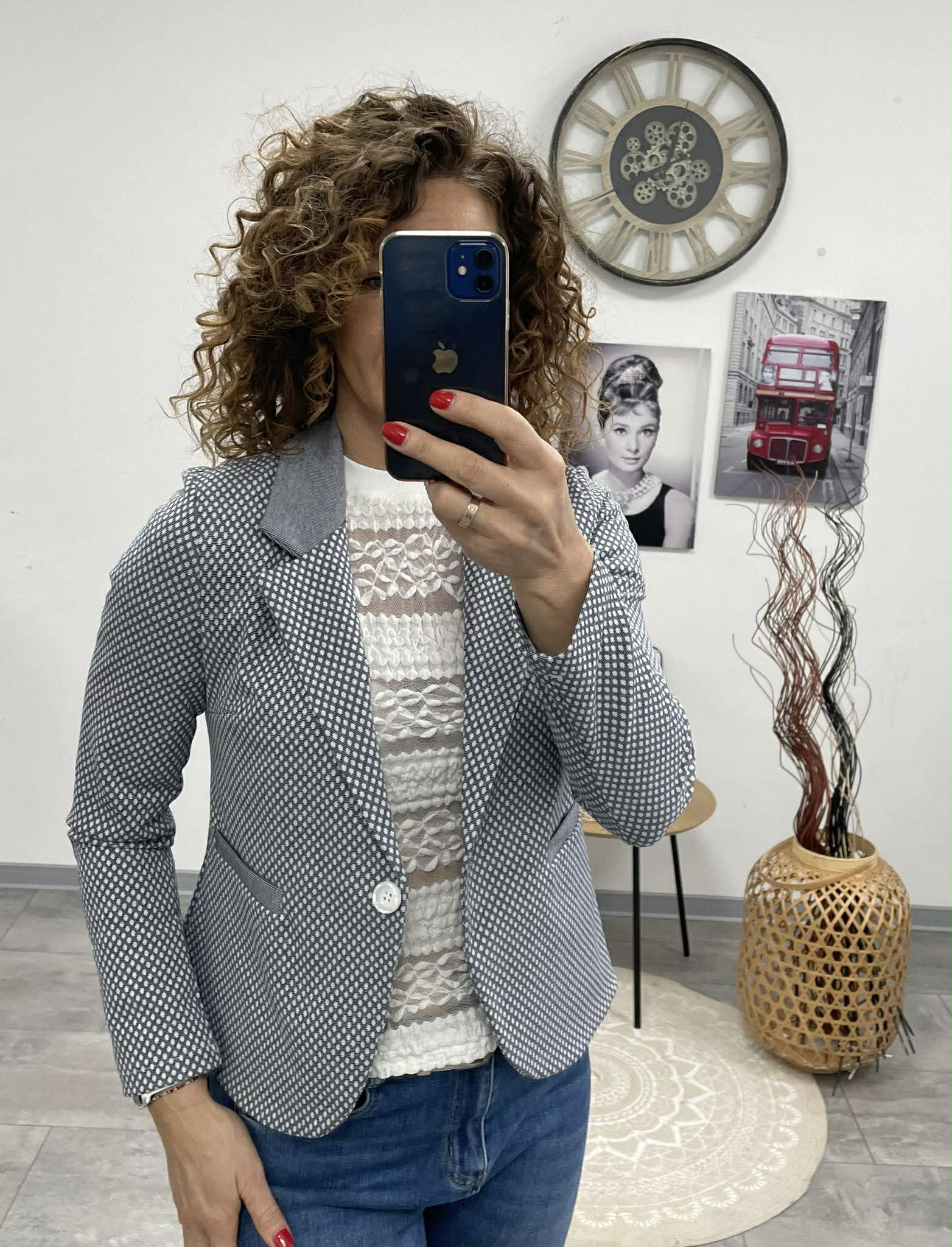 Csinos, nőies rövid blézer, ami szépen kiemeli az alakot.