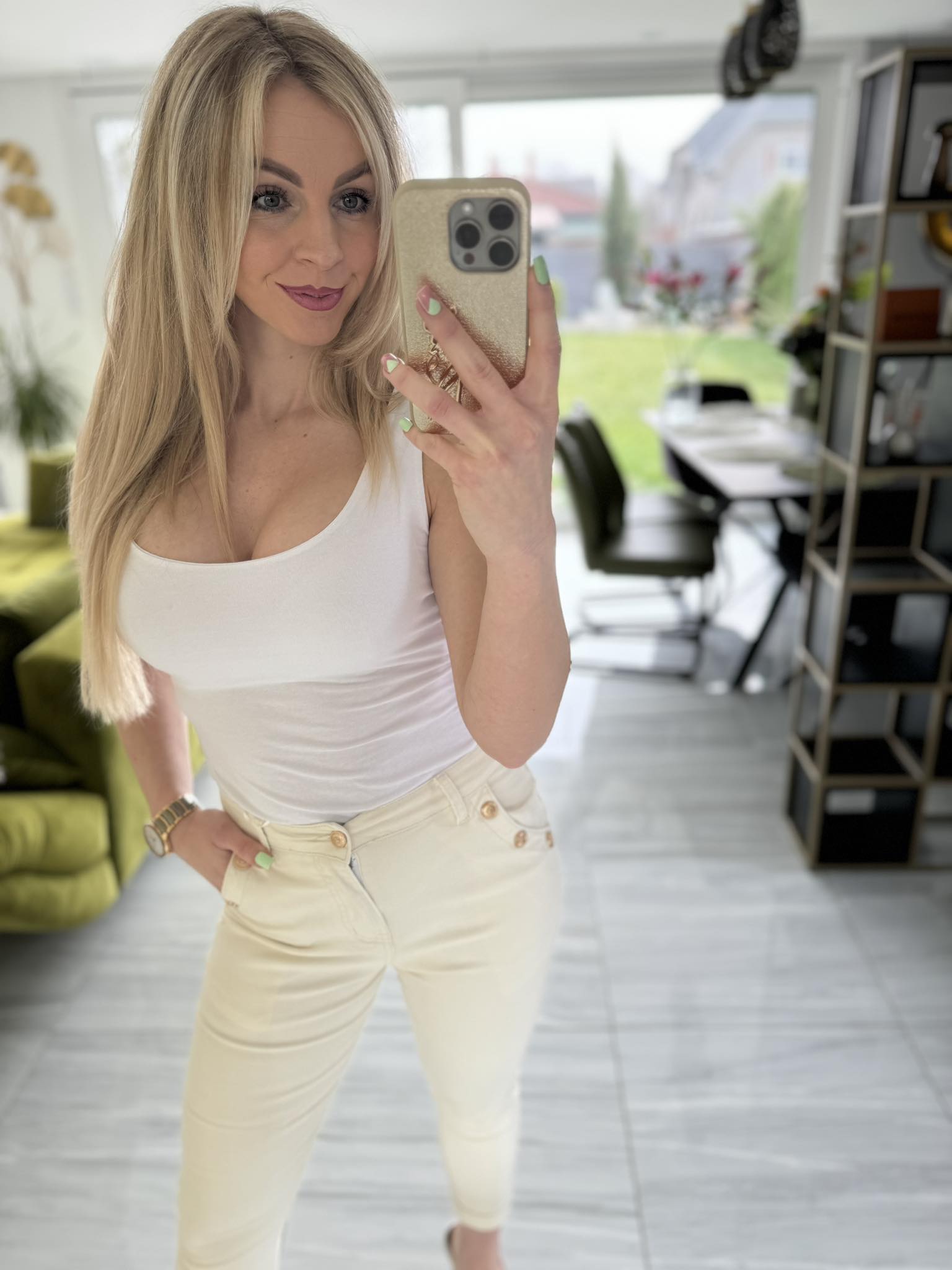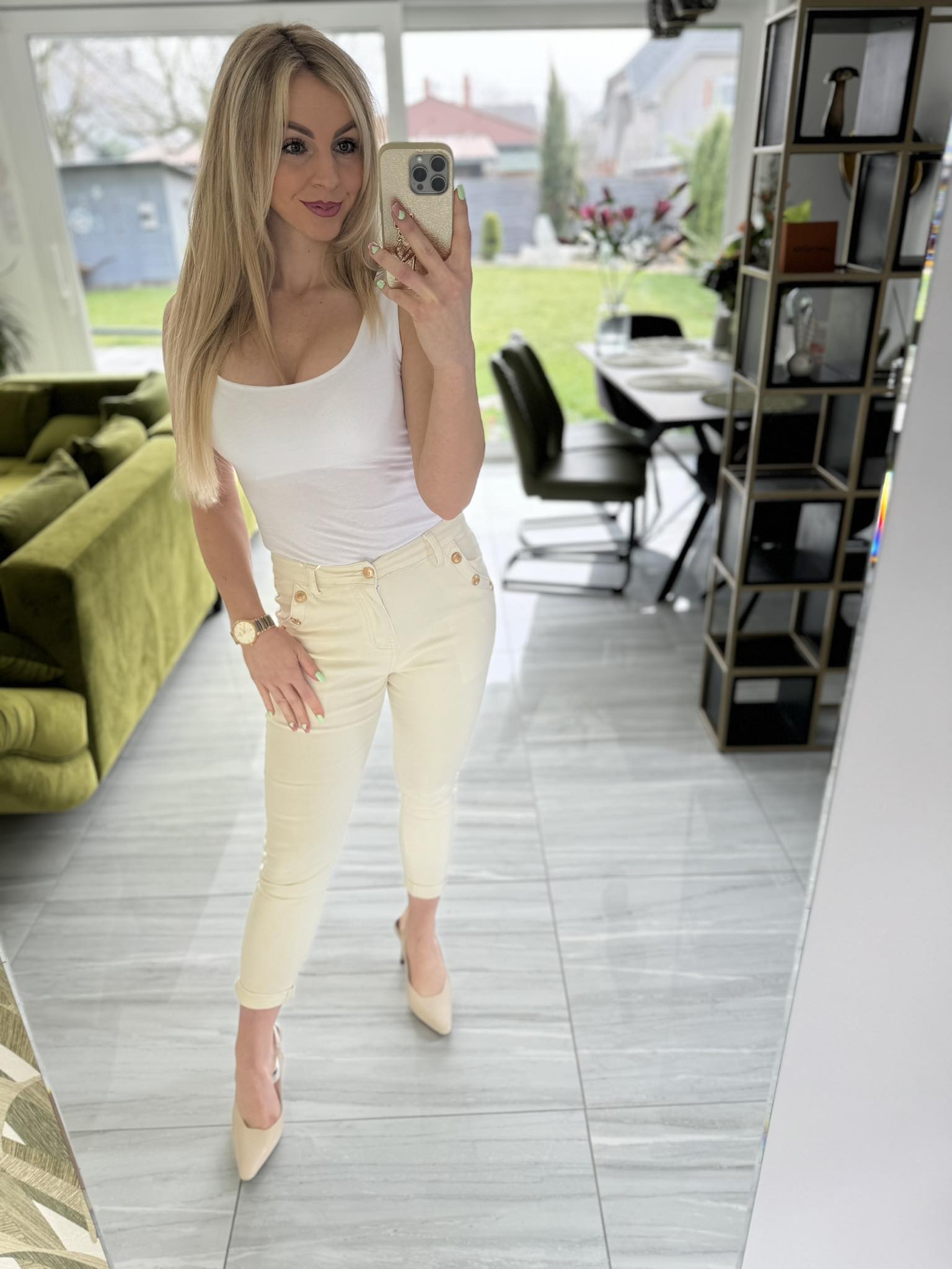 Ez a világos színű farmernadrág magas derekú fazonjával kiemeli az alakot, miközben kényelmes viseletet biztosít. Az arany gombok elegáns részletként teszik különlegessé a megjelenést.