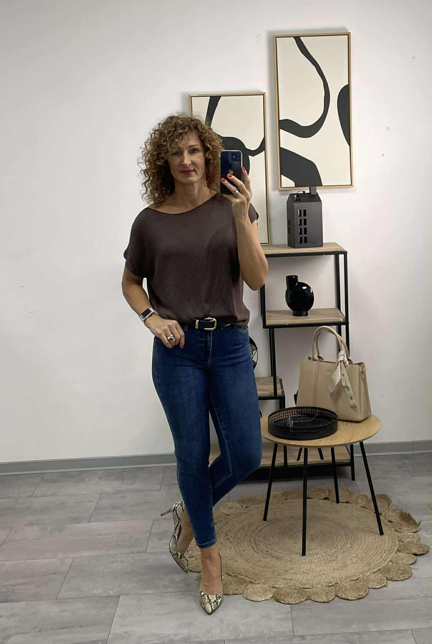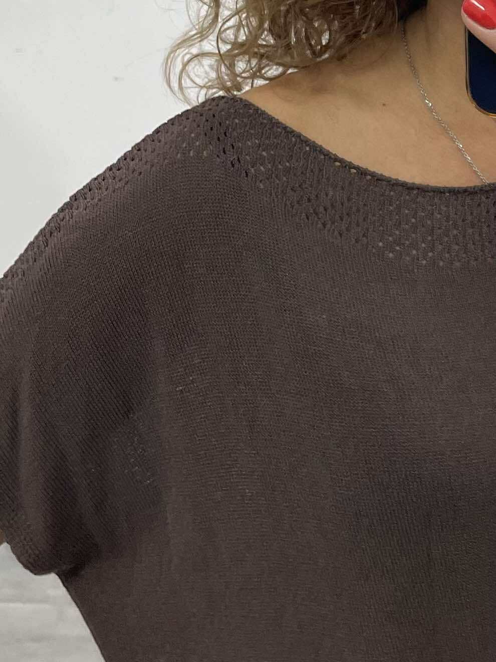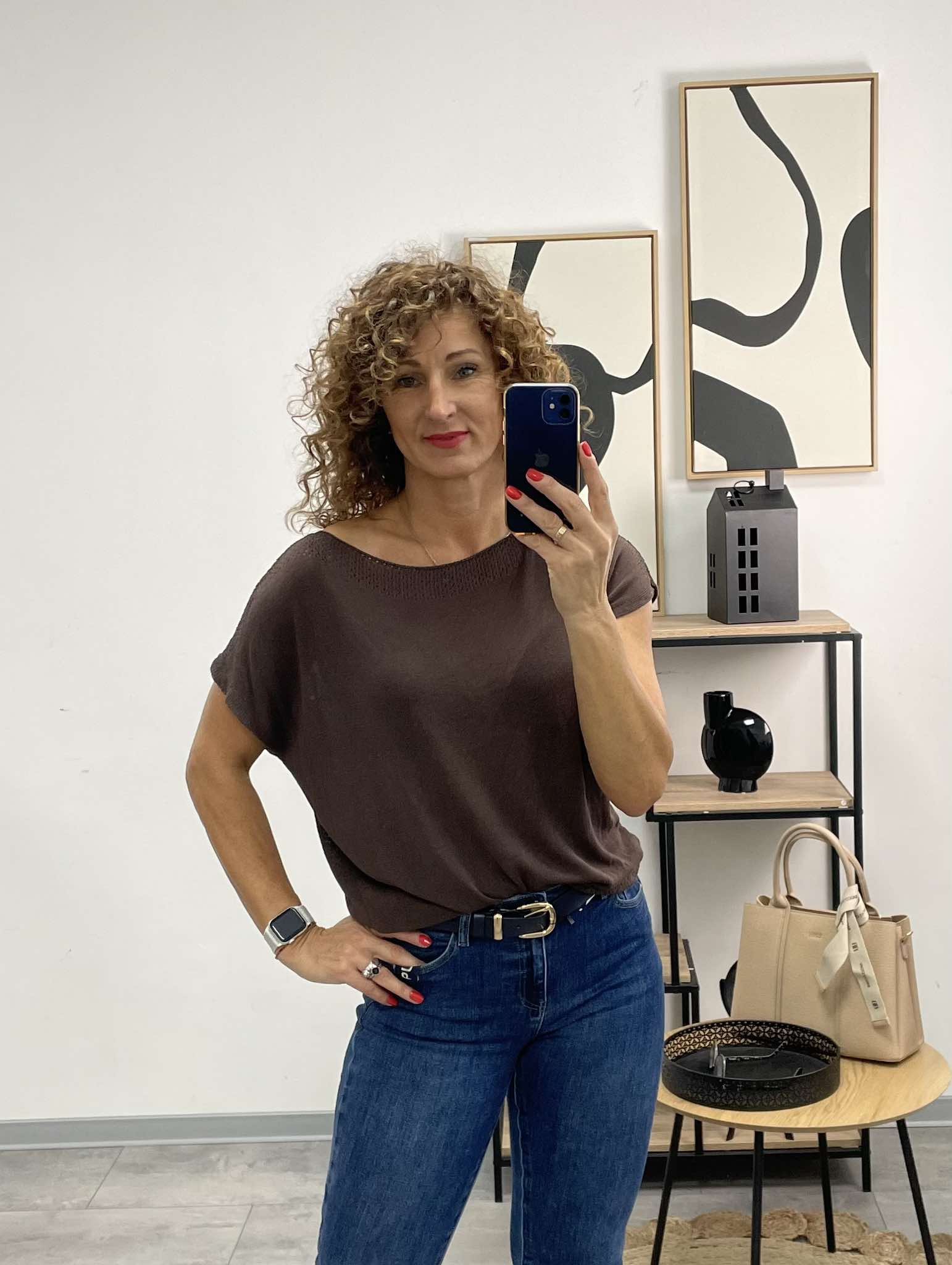 Könnyed, laza kötött anyagból készült felső, amely kényelmes viselet a mindennapokra. Csónaknyakú kialakítása nőies és elegáns hatást kelt, míg a nyakánál és alján megjelenő azsúrmintás részlet finom, különleges díszítést ad a darabnak. Egyszerűen kombinálható farmerrel vagy szoknyával, így sokoldalú alapdarabja lehet gardróbodnak.