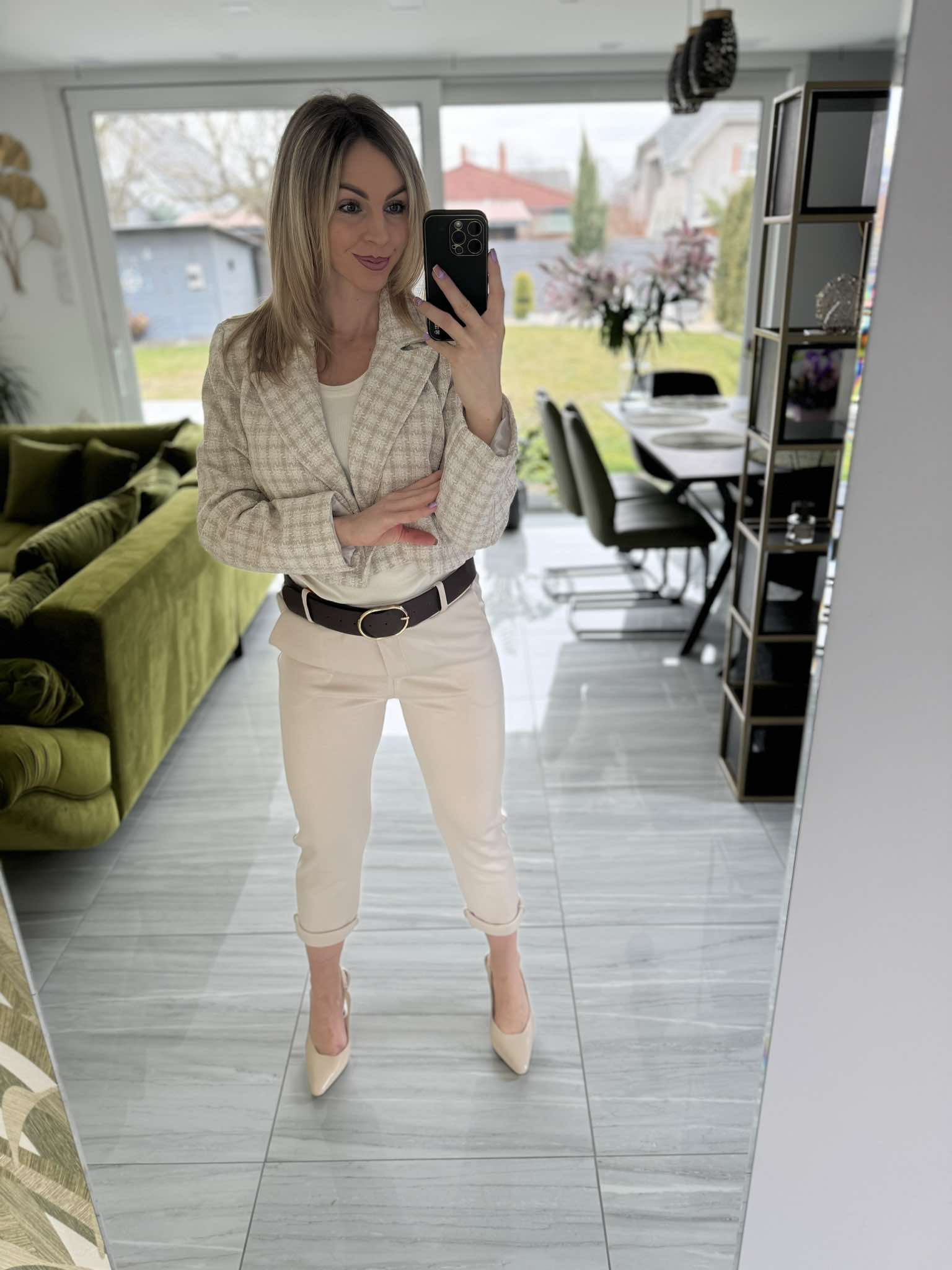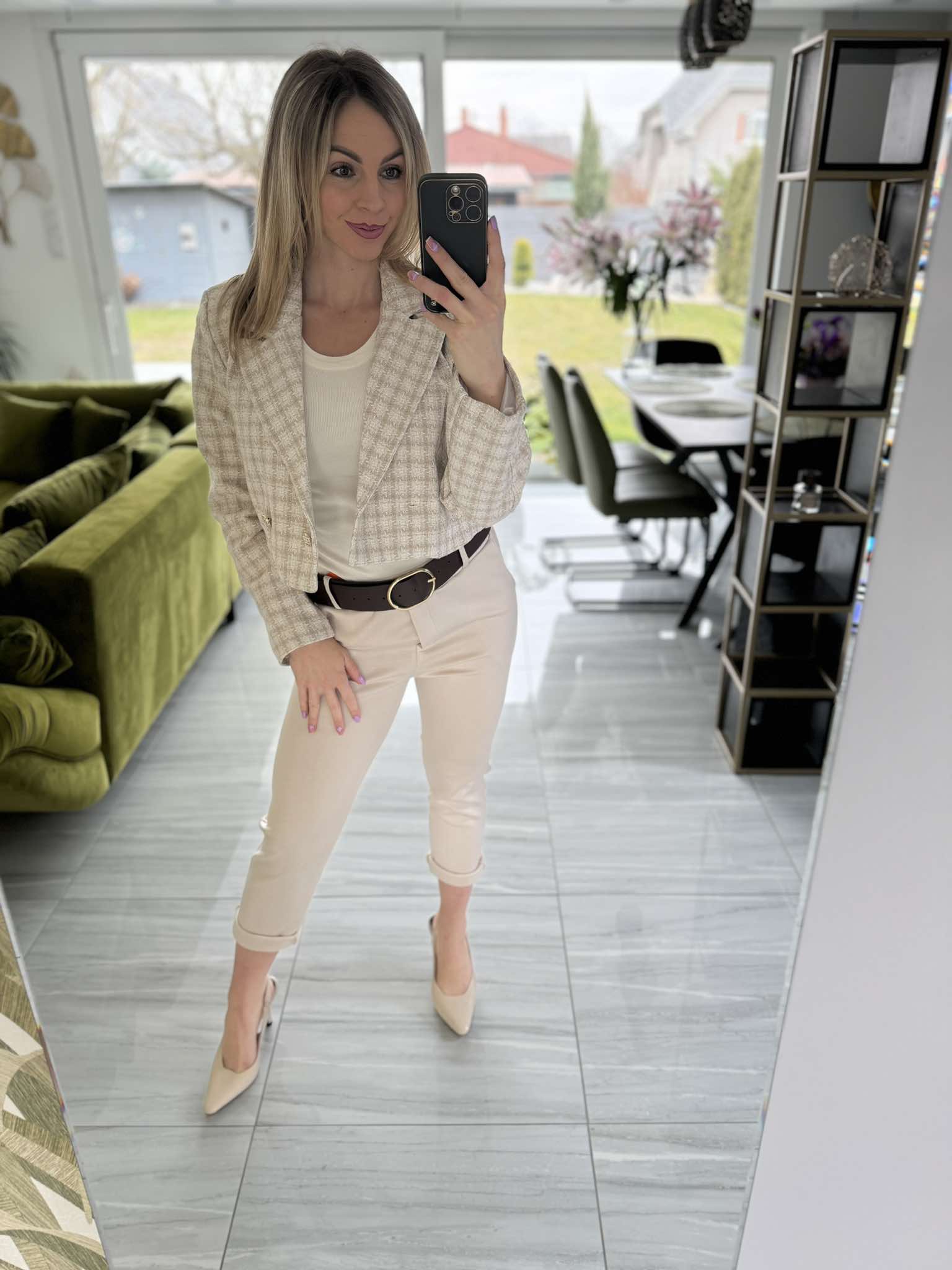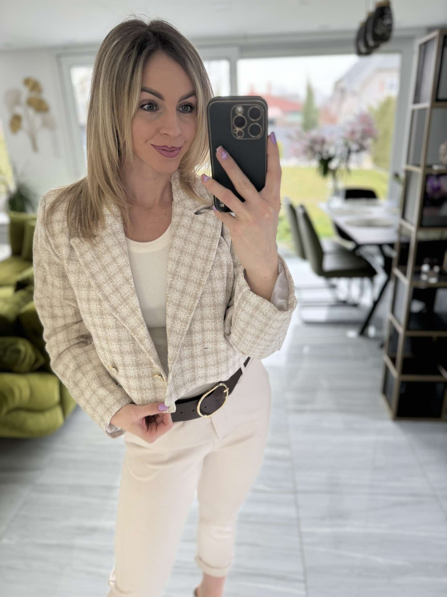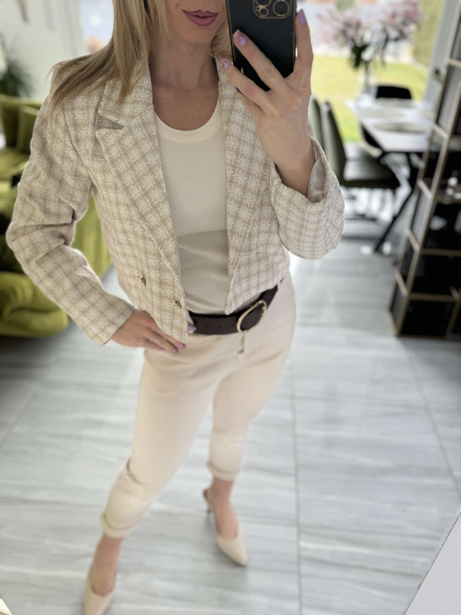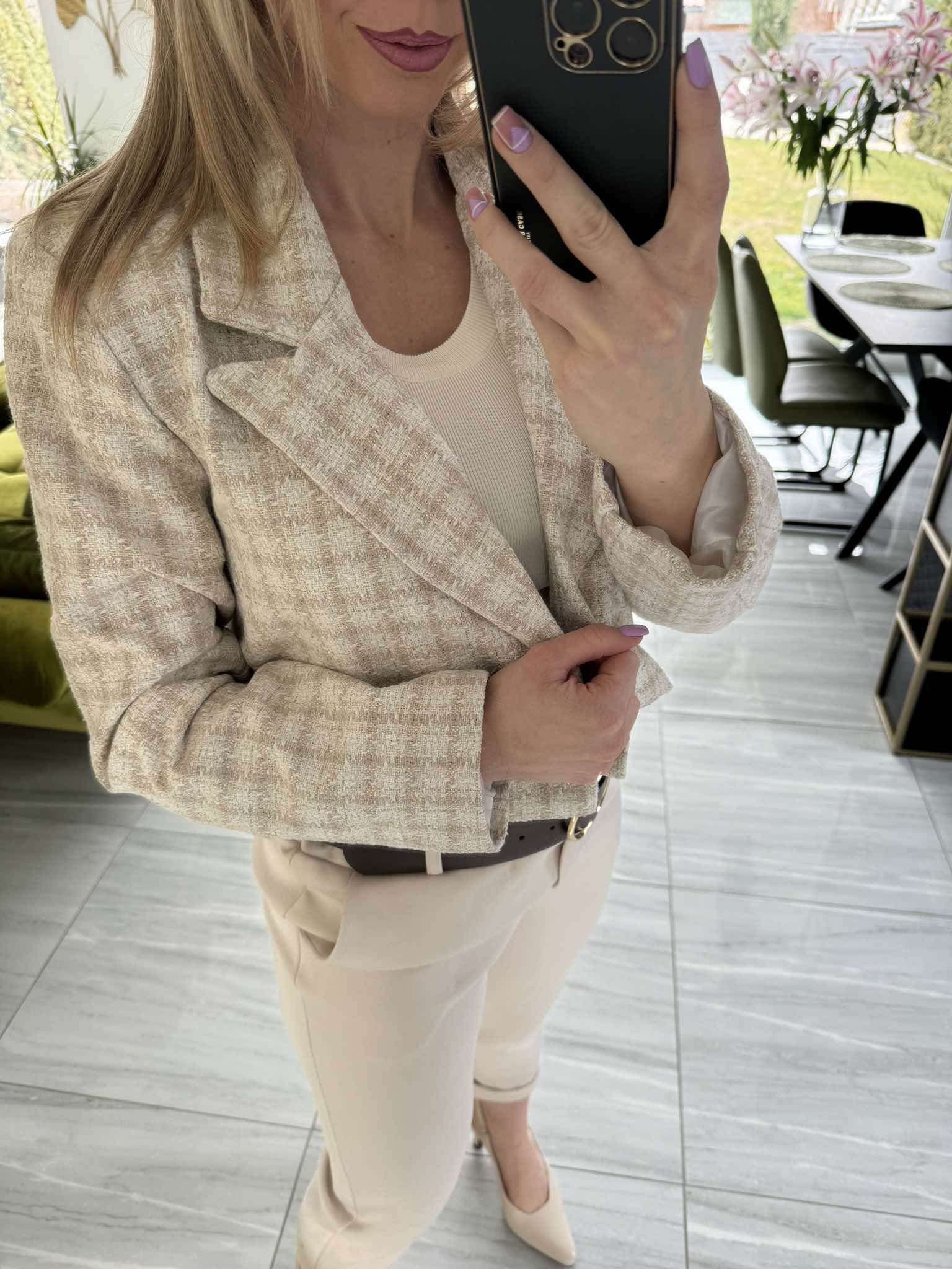 Elegáns rövid fazonú boleró, finom kockás mintával és csillogó szálakkal átszőve. Tökéletes kiegészítője egy letisztult szettnek, ha stílusos és visszafogottan nőies megjelenésre vágysz.